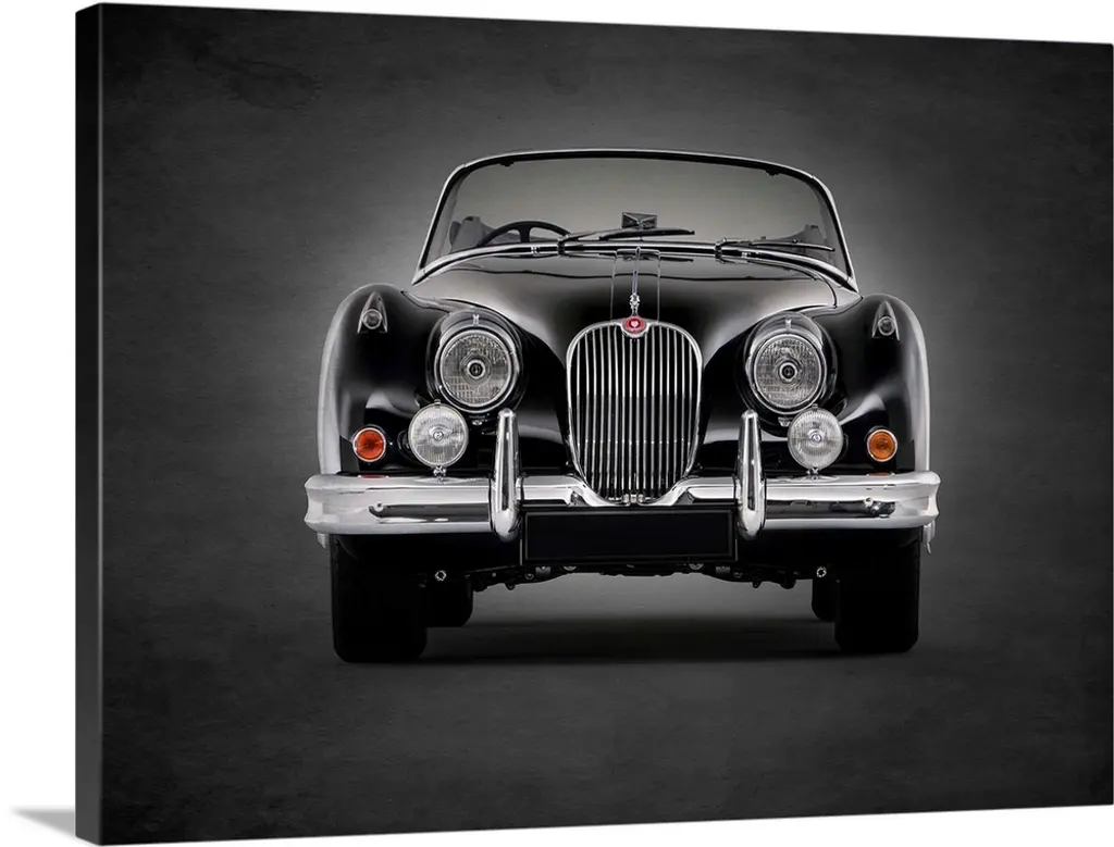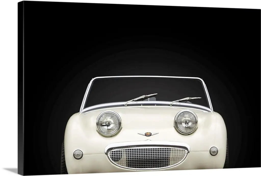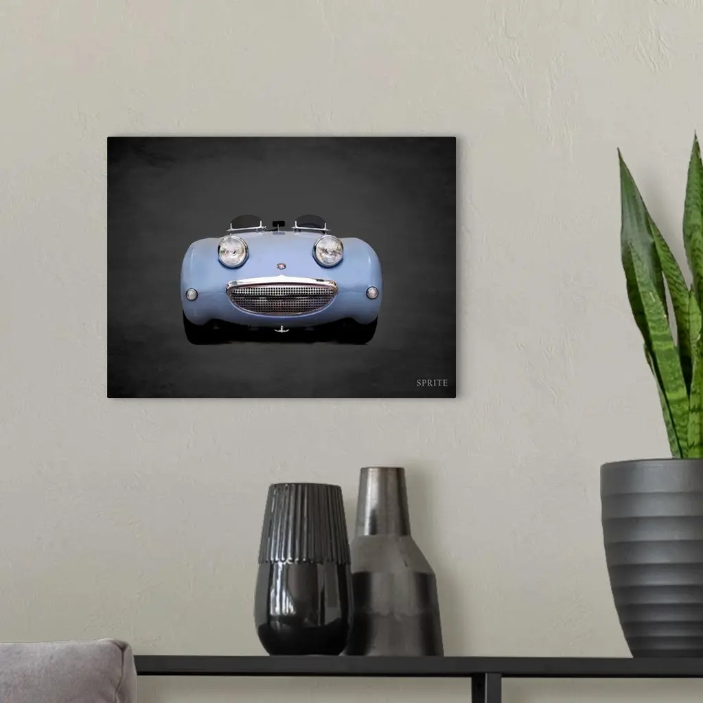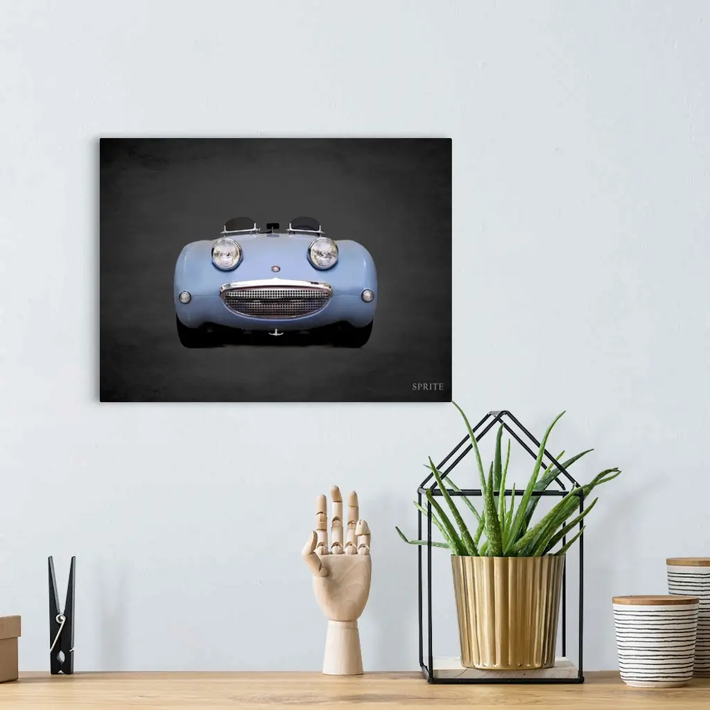 Photograph of a powder blue Austin-Healey Sprite Mk1 printed on a black background with a dark vignette.