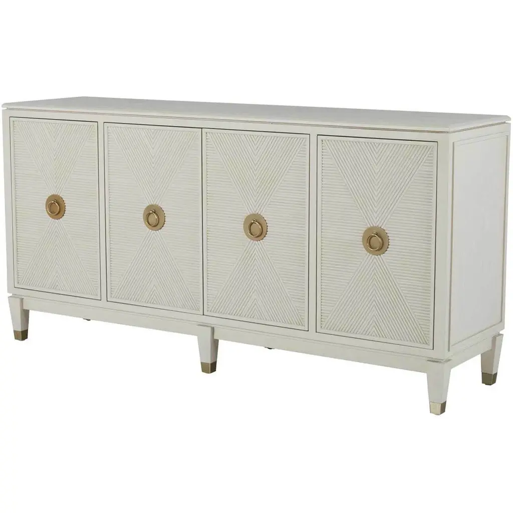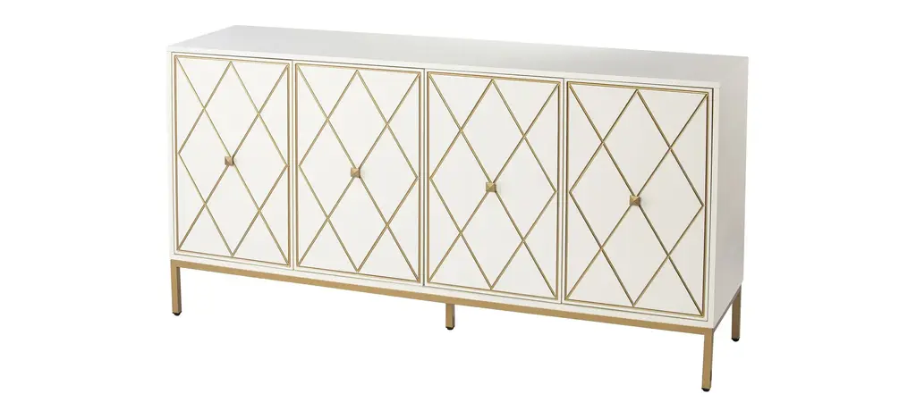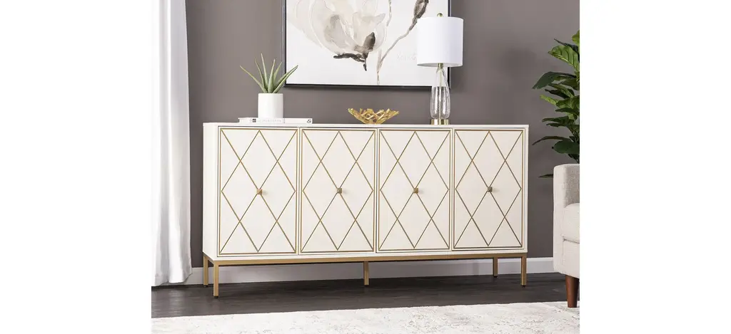 Austin Sideboard Cabinet put the finishing touch on your dining or living space with this sideboard cabinet. Adjustable shelves organize fine China, serving platters, or table d_cor, while hidden drawers tuck away flatware and accessories. Add a sleek feel to your modern design when you bring home this wide storage cabinet.
