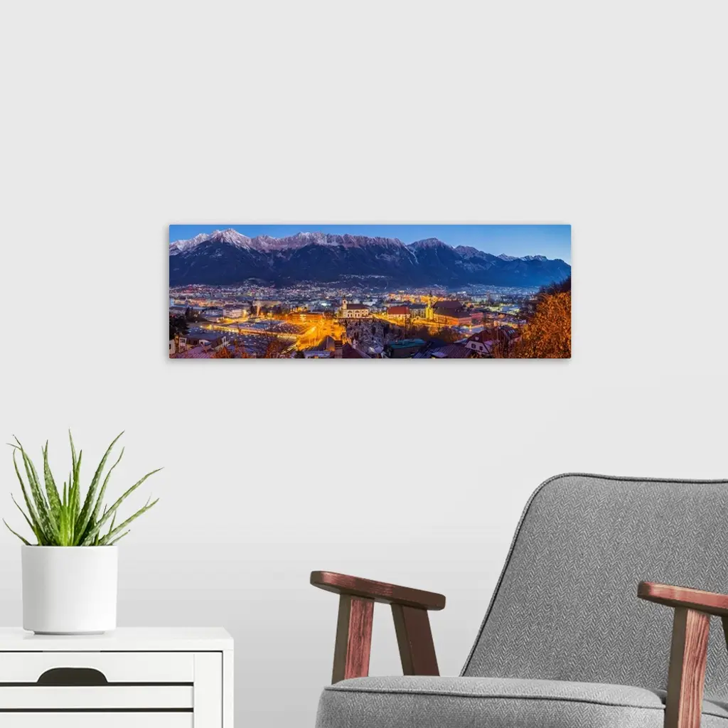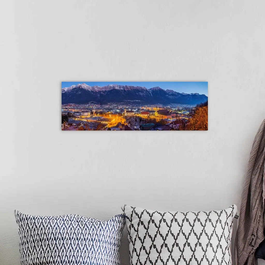 Austria, Tyrol, Innsbruck, elevated city view with the Wilten Basilica and Wilten Abbey Church, dawn, winter