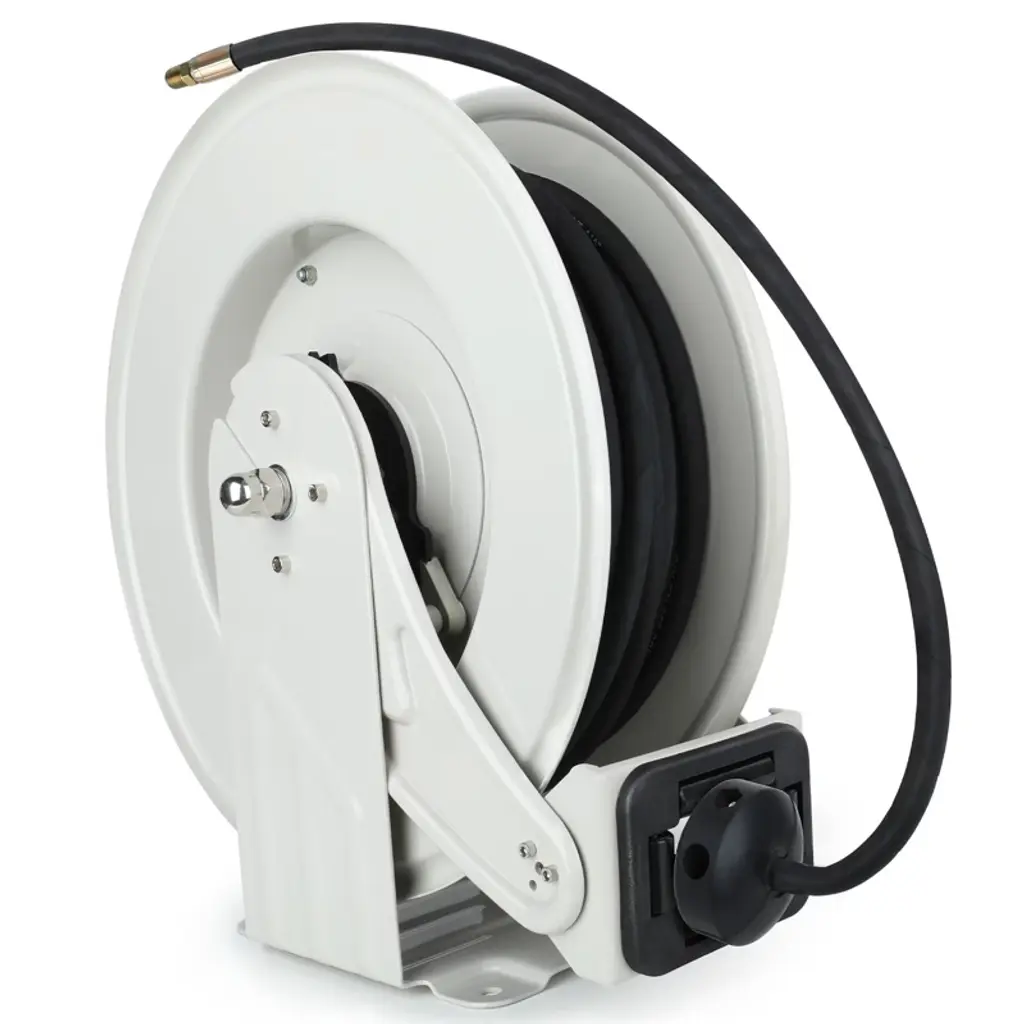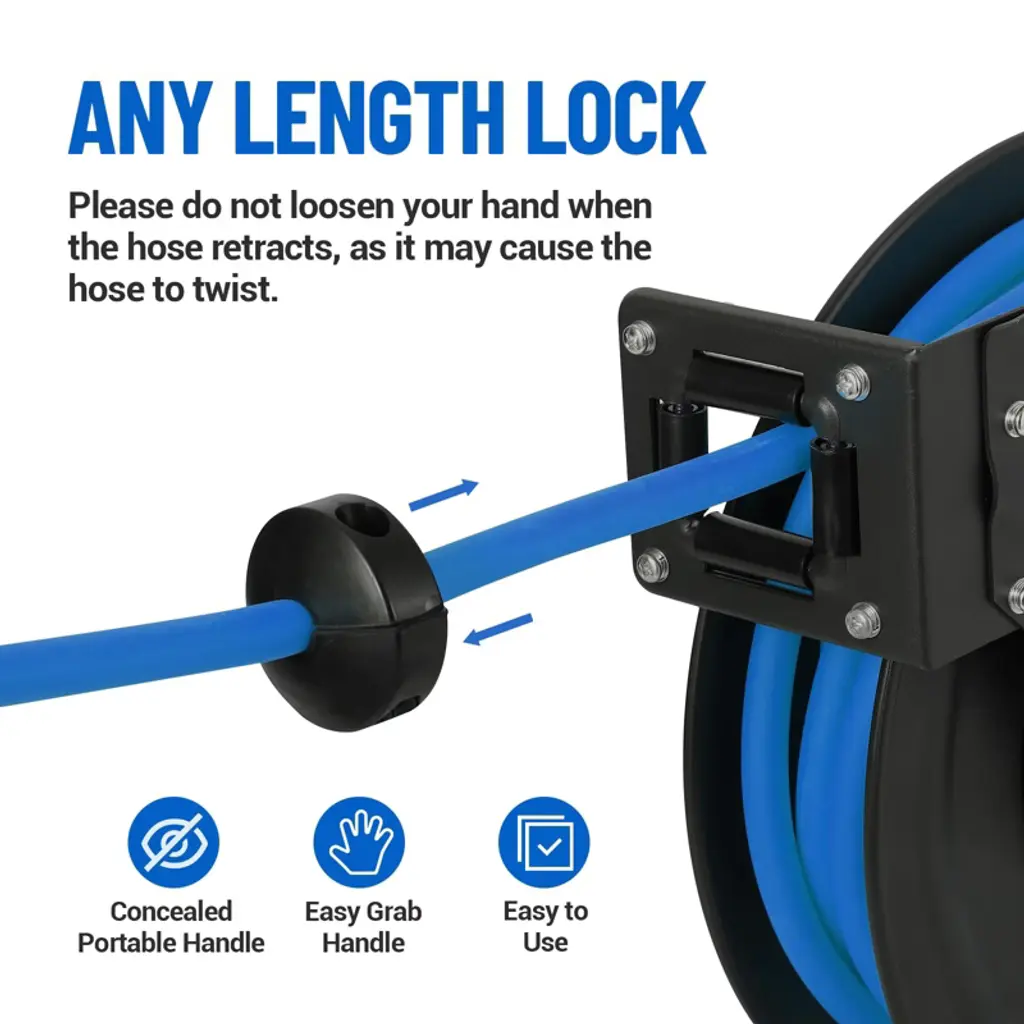 50ft Air Hose Reel Wall Mount - Automatic Retractable Air Compressor Hose Reel with 180¡ã SwivelProduct Details:1. Industrial-Grade Steel ConstructionBuilt with heavy-duty 12-gauge powder-coated steel framework, this air hose reel delivers exceptional durability against workshop impacts and environmental elements. The triple-layer epoxy coating provides superior resistance to UV radiation, chemical spills, and saltwater corrosion, making it ideal for auto shops, coastal facilities, and demanding industrial environments.2. All-Weather Performance HoseFeatures a professional 3/8" x 50ft hybrid hose that maintains extreme temperature flexibility from -40¡ãF to 176¡ãF. The oil-resistant construction delivers full 300 PSI power for high-demand tools including framing nailers, impact wrenches, orbital sanders, and tire inflation systems without cracking, stiffening, or performance loss in any season.3. Multi-Position Adjustable SystemRevolutionary positioning technology offers three functional configurations: flush wall-mount for space saving, angled deployment for under-vehicle work, and full extension for overhead applications. The 180-degree rotating base provides complete directional flexibility, enabling access to every corner of the workshop without dragging or repositioning the reel.4. Tangle-Free Automatic RewindExperience effortless operation with four guided rollers that ensure smooth extension and retraction without kinks or tangles. The innovative magnetic braking system securely locks at any length from 3 feet to the full 50-foot capacity, while the quick wrist-flick retraction mechanism provides instant, organized storage after use.5. Comprehensive Lifetime SupportEngineered with factory-sealed brass fittings for permanent leak protection and includes ready-to-connect installation components. Backed by lifetime technical support via email/chat and a 2-year hassle-free warranty with free replacement parts¡ªsimply submit a photo of any worn components for immediate service.Specifications:? Hose Length: 50 Feet? Hose Diameter: 3/8 Inch? Max Pressure: 300 PSI? Temperature Range: -40¡ãF to 176¡ãF? Construction: 12-Gauge Powder-Coated Steel? Rotation: 180¡ã Swivel Base? Positions: 3 Adjustable Settings? Installation: Wall Mount? Operation: Automatic Rewind with Magnetic Brake? Warranty: 2-Year Full Coverage + Lifetime Support? Weight: 23.5 Pounds