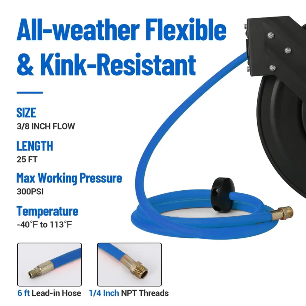 Auto Rewind Air Compressor Hose Reel 25ft 3/8" 300psi | Commercial-grade Dual Wall Mount Brackets + Tangles-free Hybrids Hose
