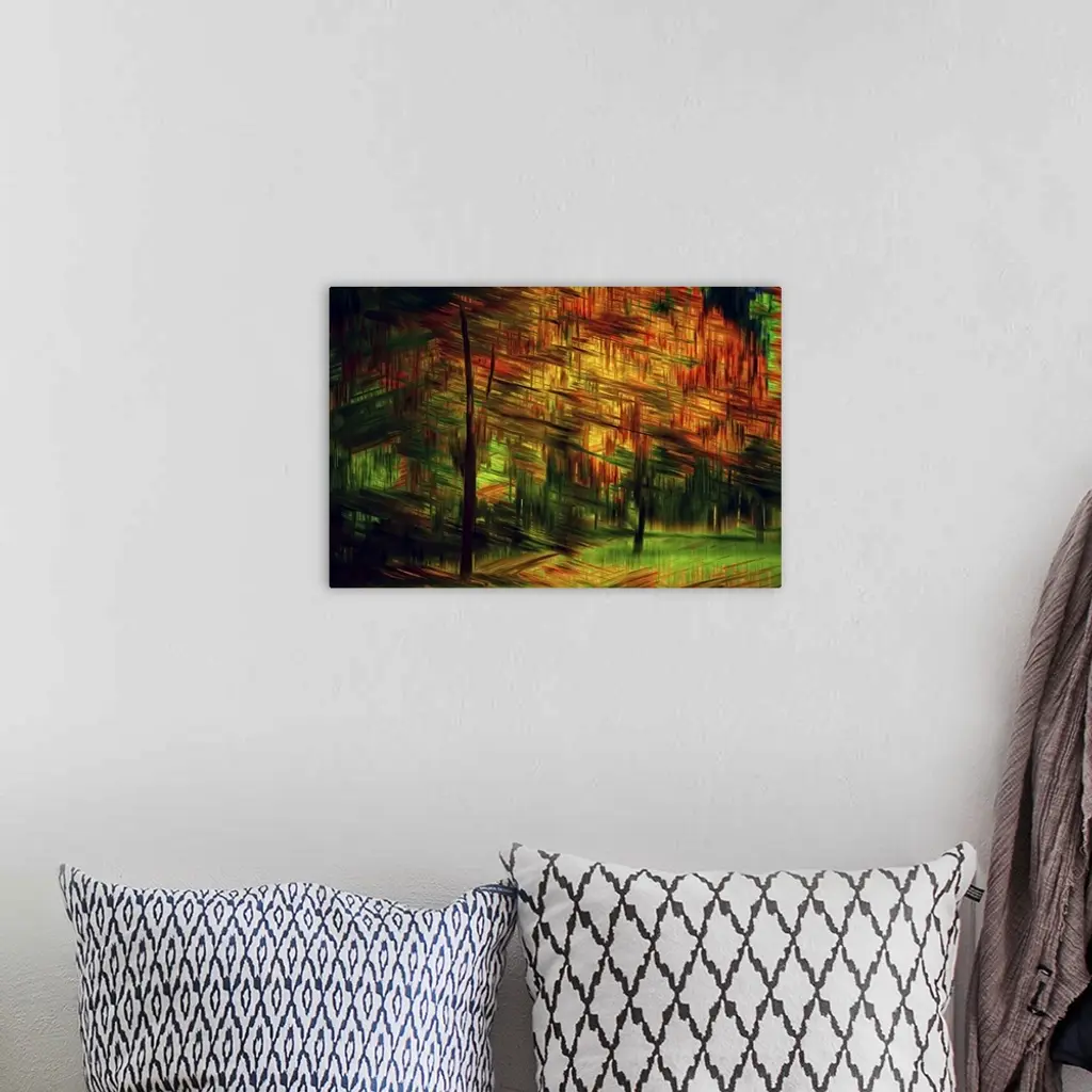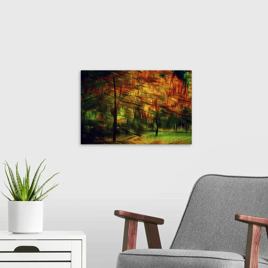 Trees with leaves in golden, orange glory, representing the sheer bewilderment that all that fantastic color can bring to the senses. The image was made using the in-camera burst multiple exposure + ICM (Intentional Camera Movement) technique in overlapping straight strokes. Ursula Abresch Abstract Fall Images Collection.