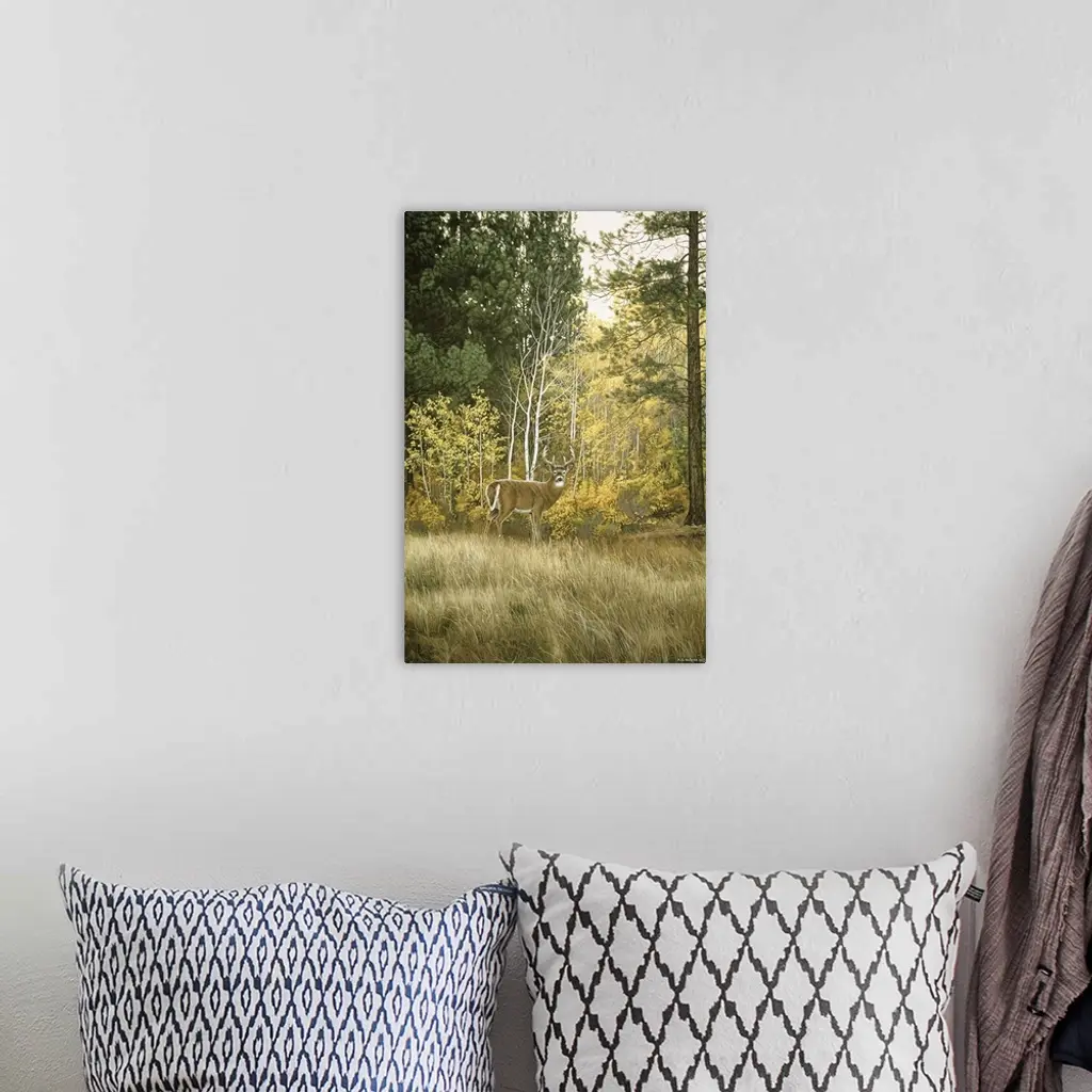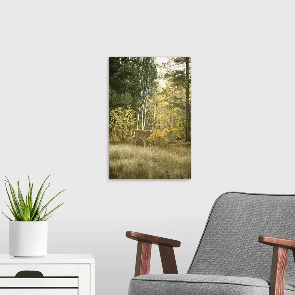 A buck looks back before entering the woods.