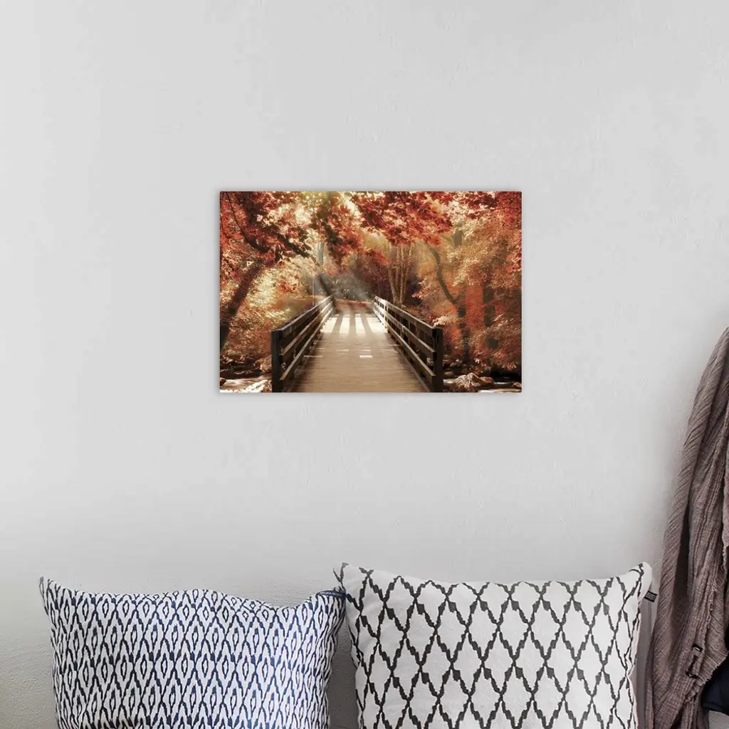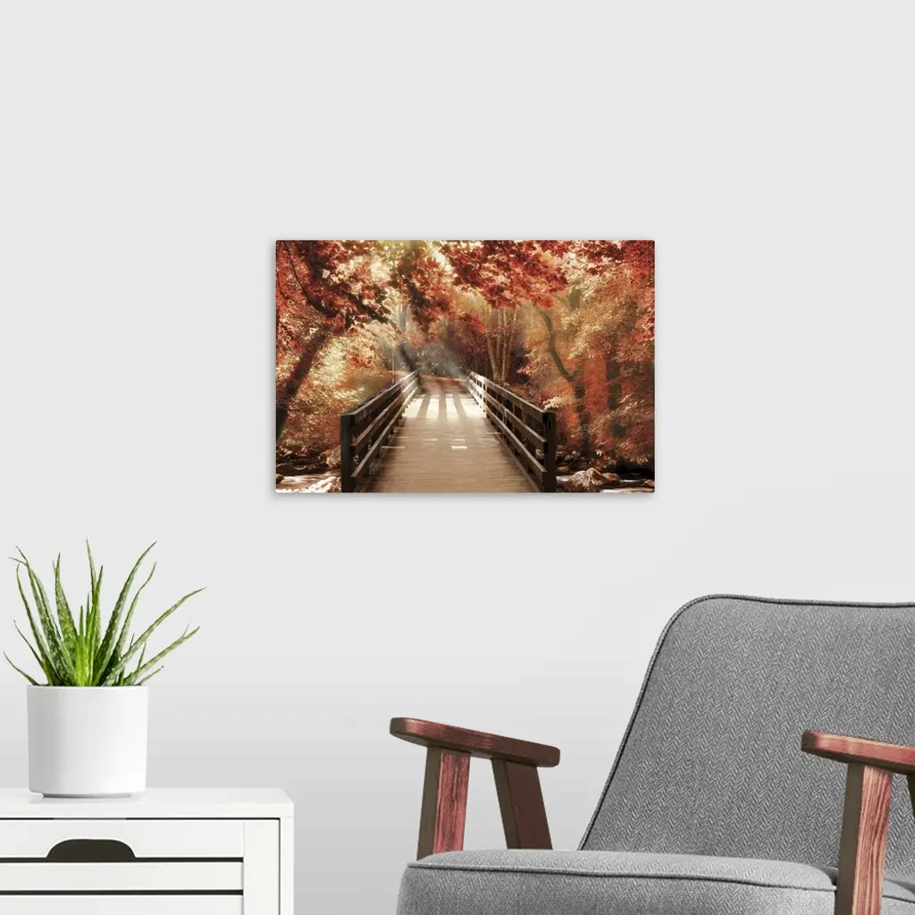 Photograph of a bridge going over a creek in woods covered in red Fall trees with beautiful sunlight.