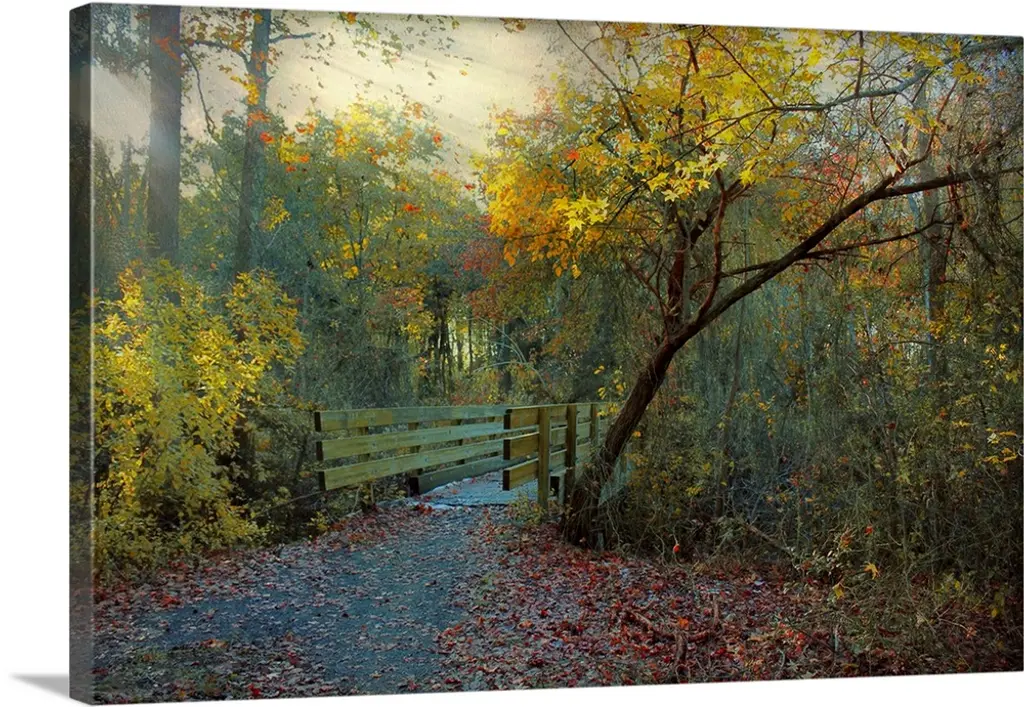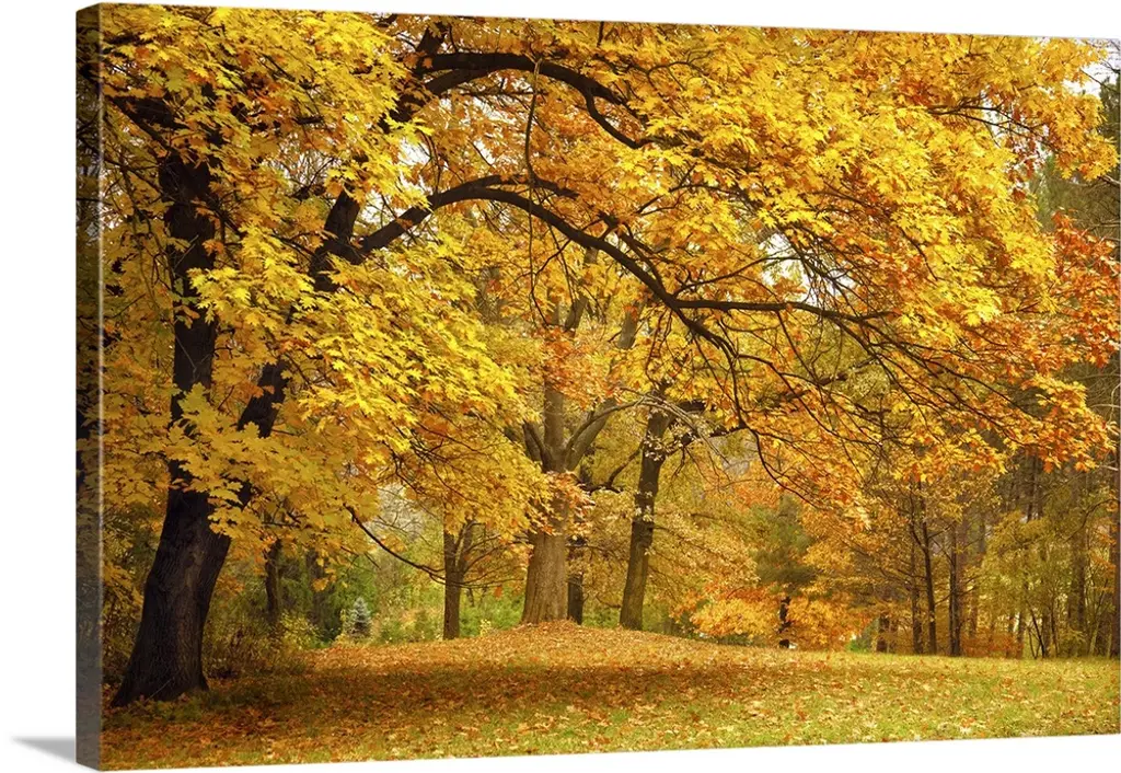 In this photograph two maple trees are in the process of losing their leaves by a fence and forest in Michigan (MI). Soft focus creates a dreamlike appearance.