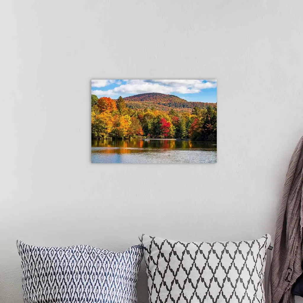 Autumn coloured trees in a forest around a small lake, Sally's Pond, Quebec, Canada.