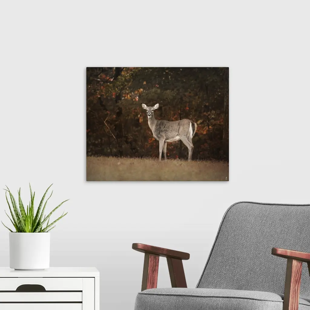 A female deer at the edge of a forest in the fall.