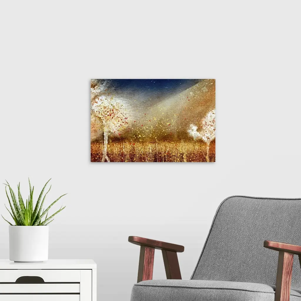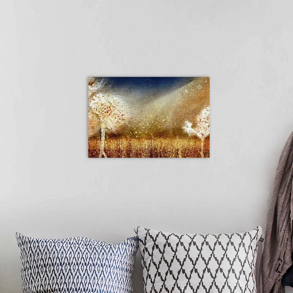 Extreme closeup of graffiti and rust on a train, the original image looked like windblown white trees. Fall leaves blowing in the wind are painted in. Ursula Abresch Graffiti Collection