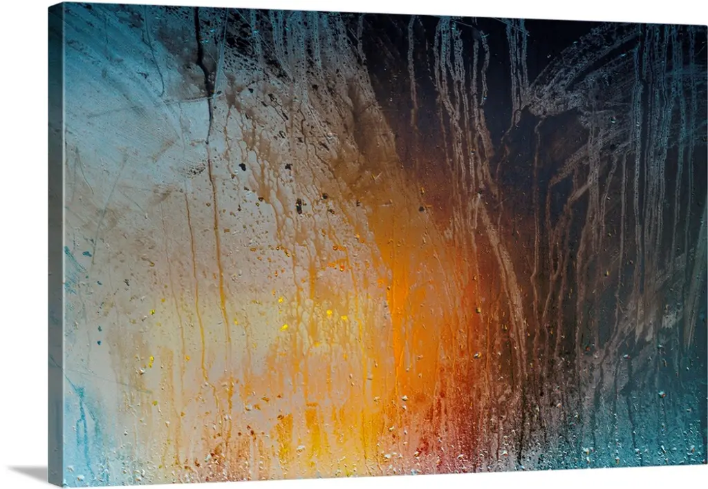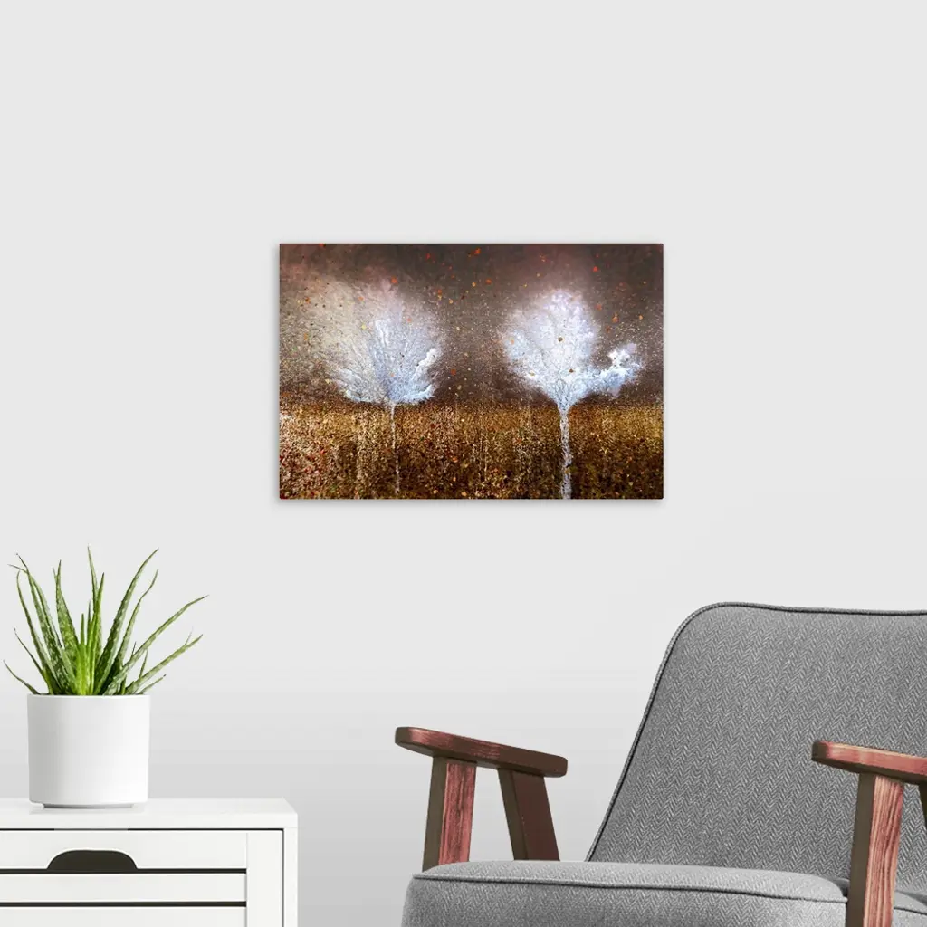 Extreme closeup of graffiti and rust on a train, the original image looked like windblown white trees. Fall leaves blowing in the wind are painted in. Ursula Abresch Graffiti Collection