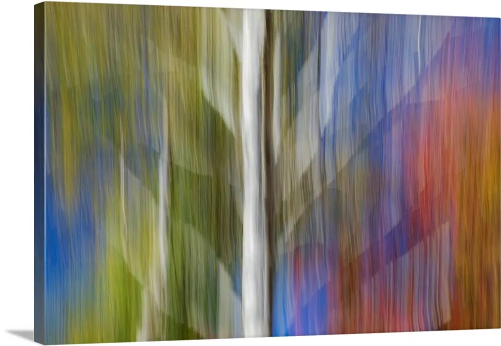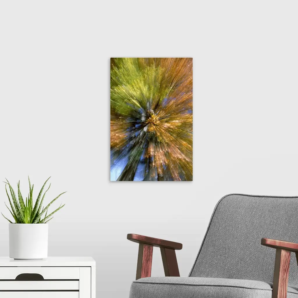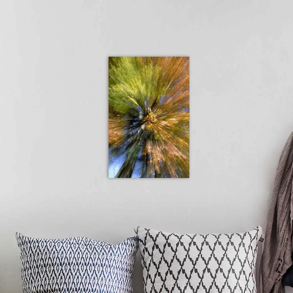 Tall canvas of fall leaves overlaid with lines spreading out from the center in a circular direction.