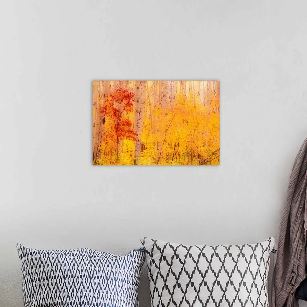 This landscape photograph shows a forest filled with brightly color leaves on small trees growing on the forest floor.