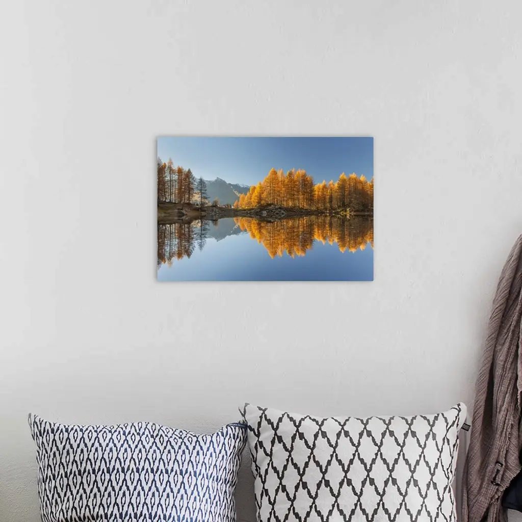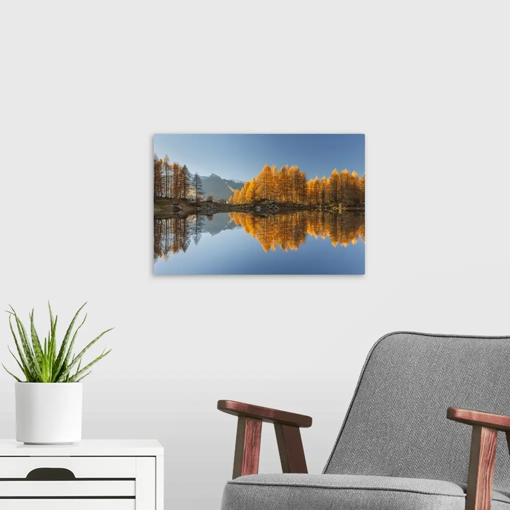 Autumn Larches Reflected On Azzurro Lake, Lombardy, Italy
