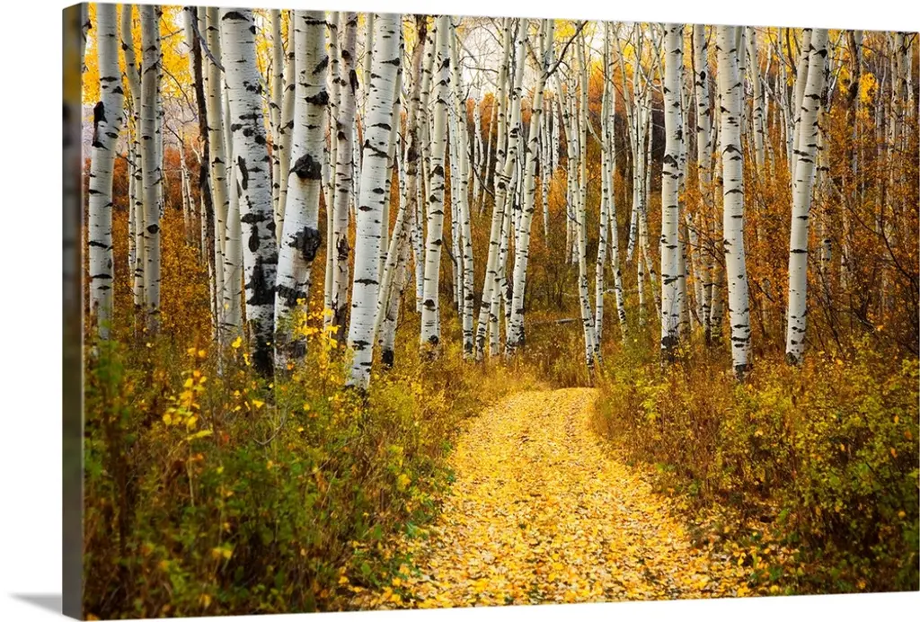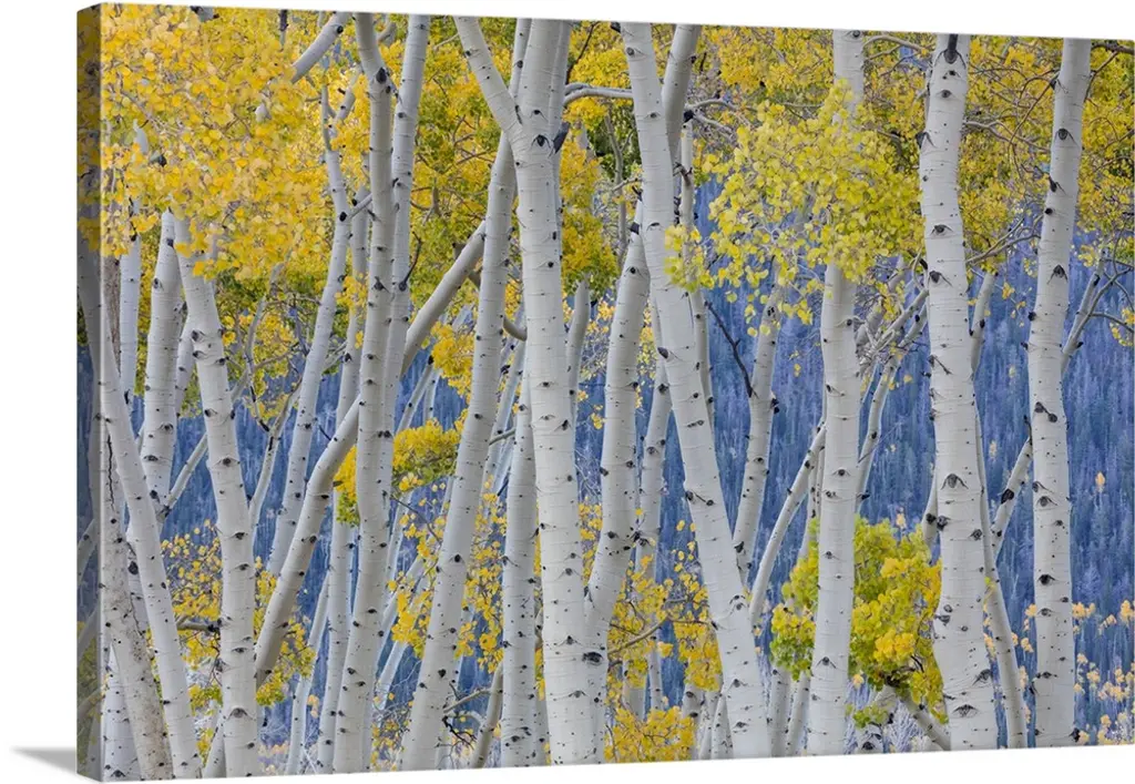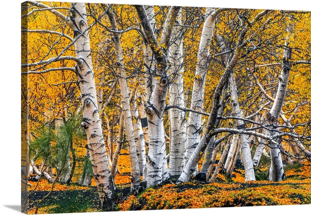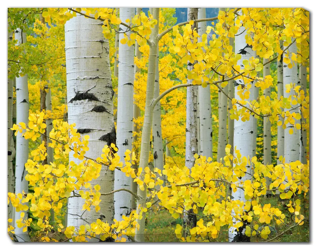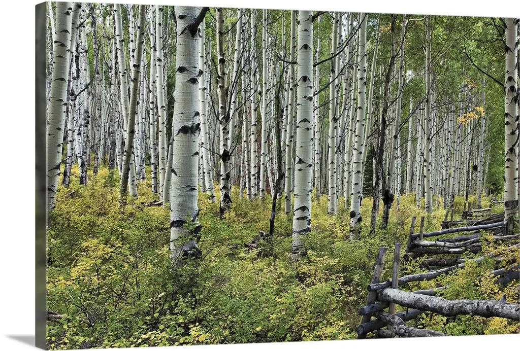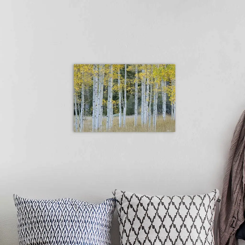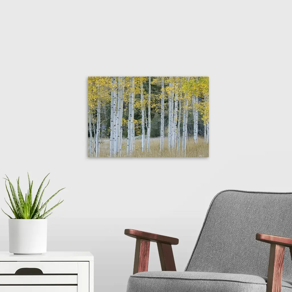 Huge photograph shows a scattered group of aspen trees sitting within an open field of grass. Towards the background of this photograph, a dense tree line can be seen across the entire horizontal space.