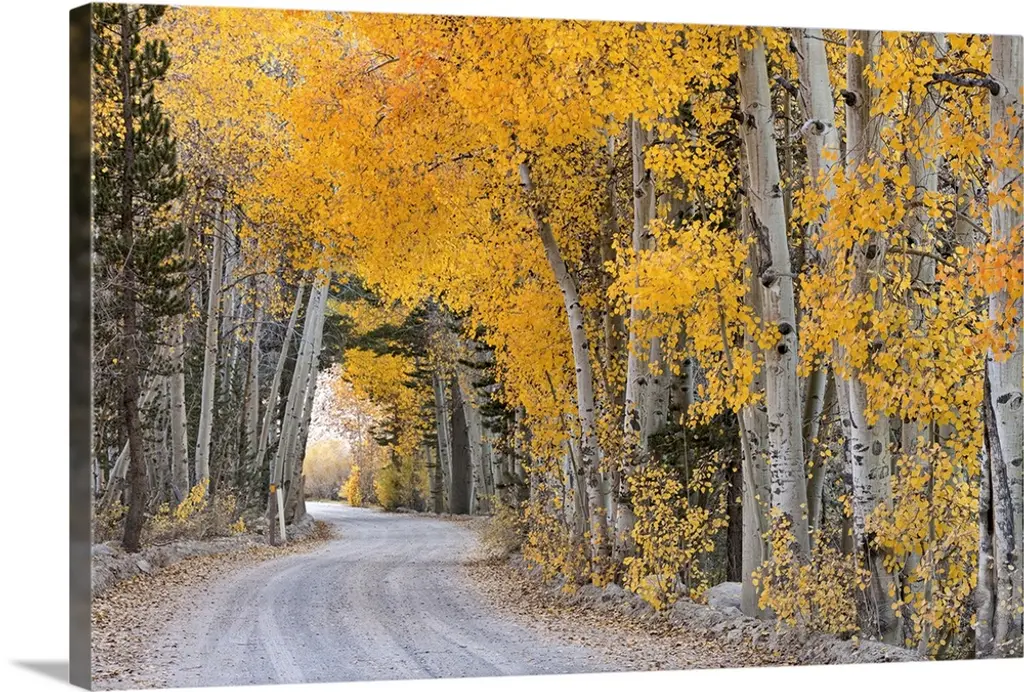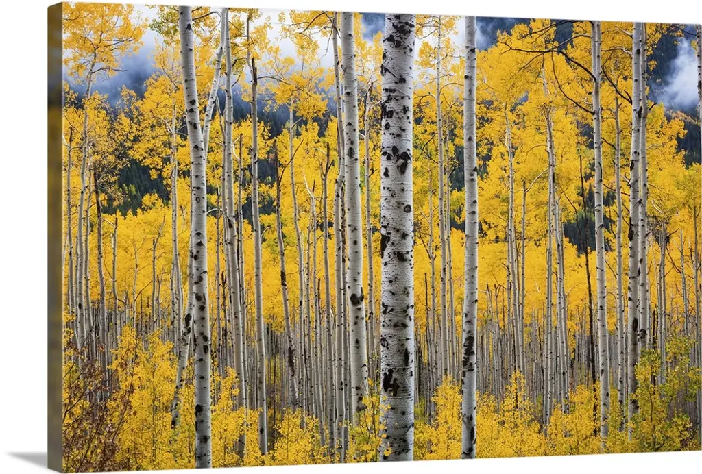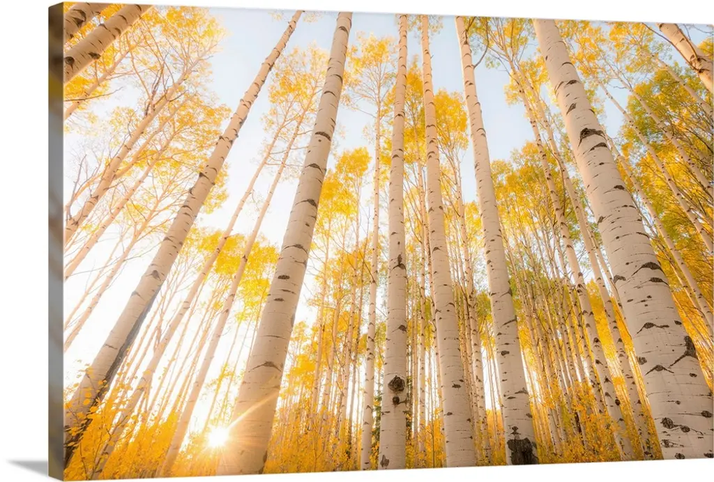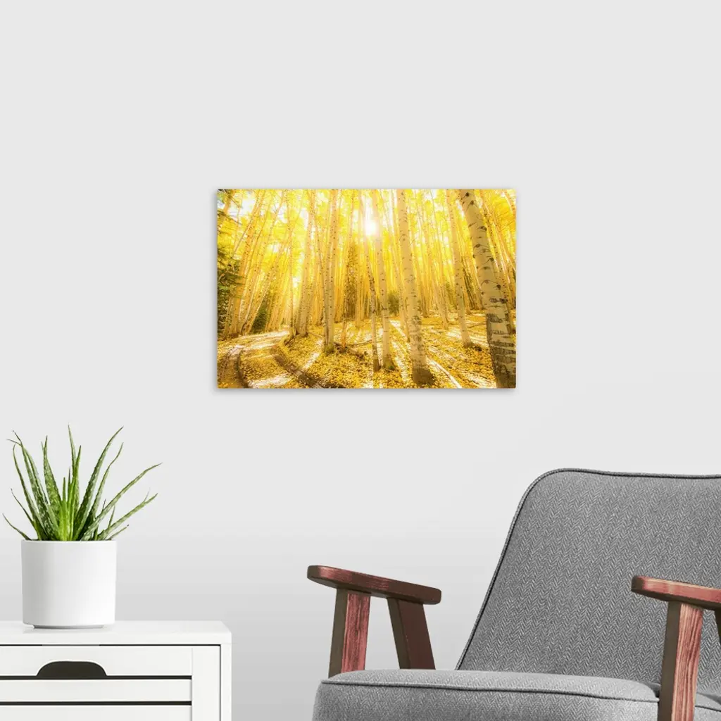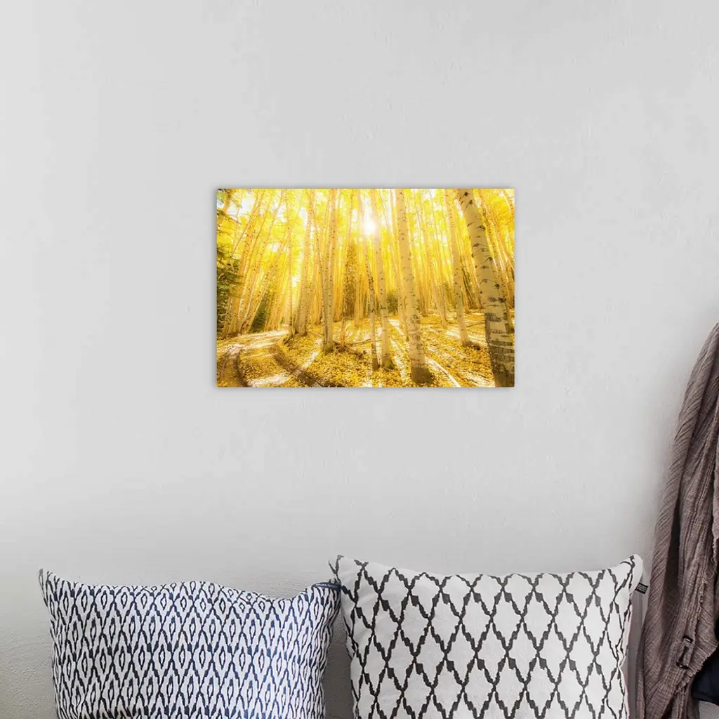 Landscape photograph of bright yellow birch trees in the woods with the sun shining through.