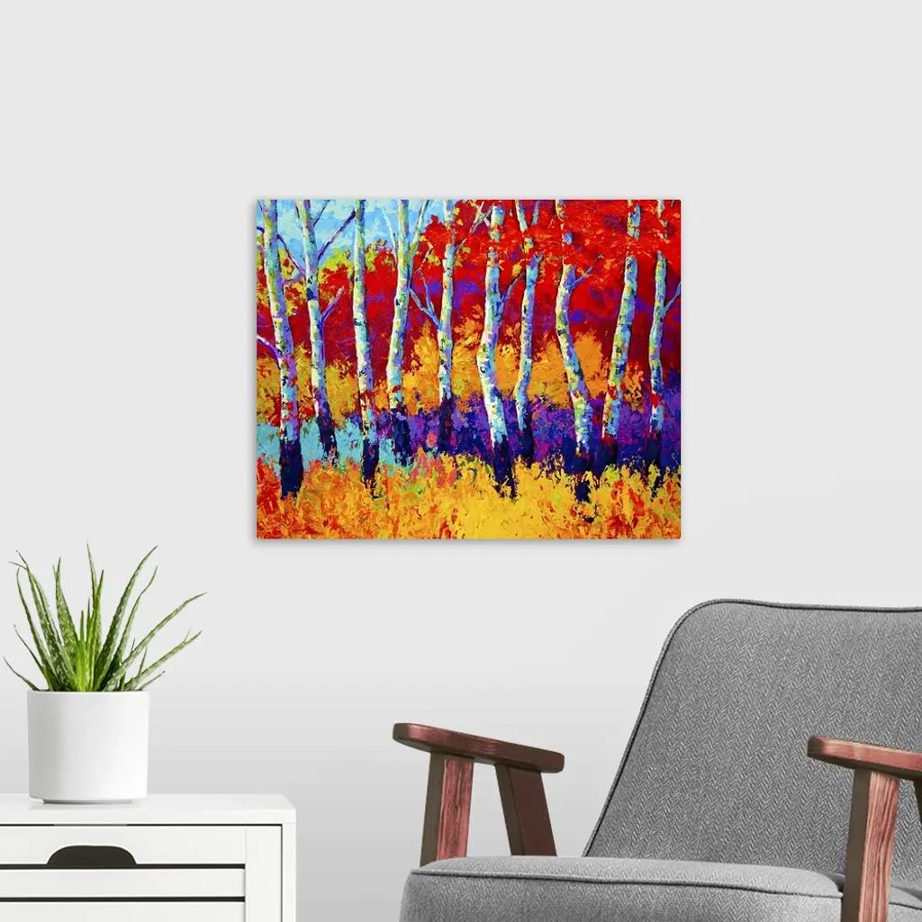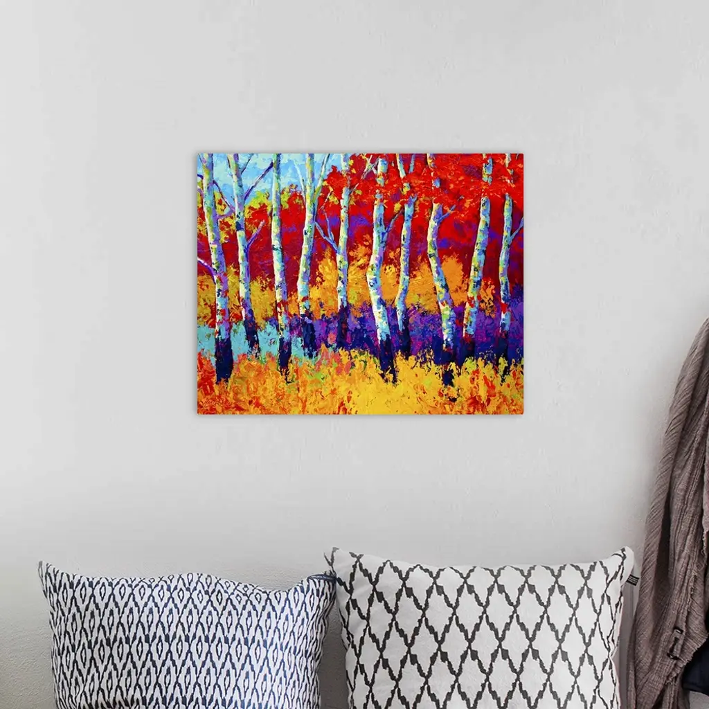 Large abstractly painted canvas print of a line of trees with fall foliage in the background.