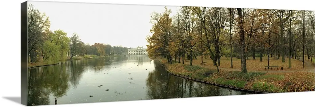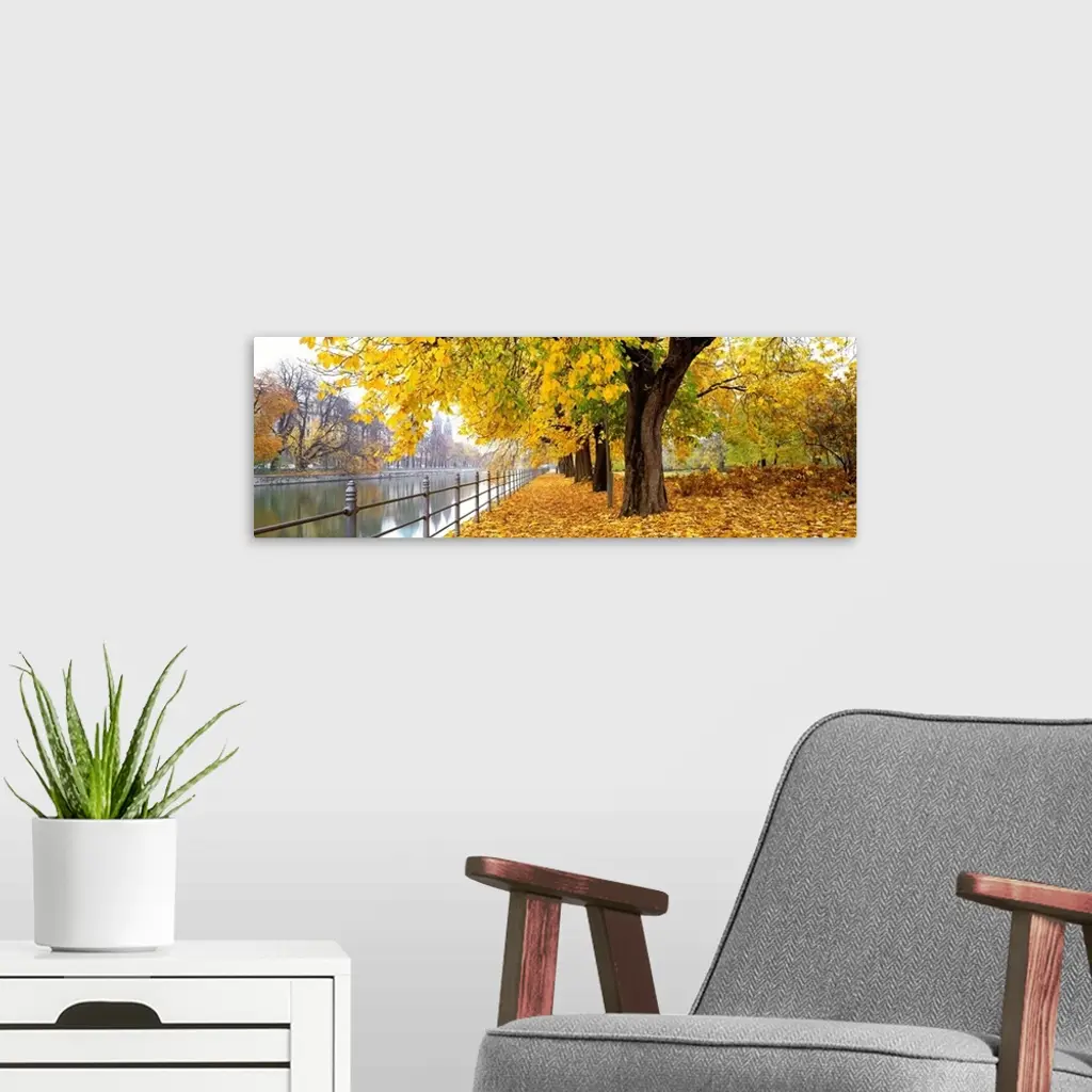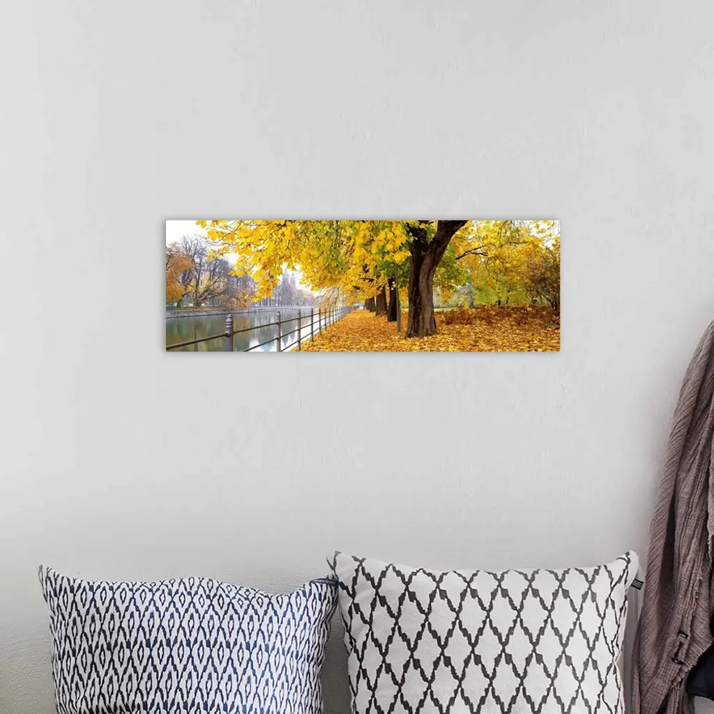 Large panoramic photograph of city riverbank in Munich, Germany as fall/autumn turns to winter and colorful leaves collect on the ground. Trees and buildings are reflected in the calm waters of the river in mostly warm tones.
