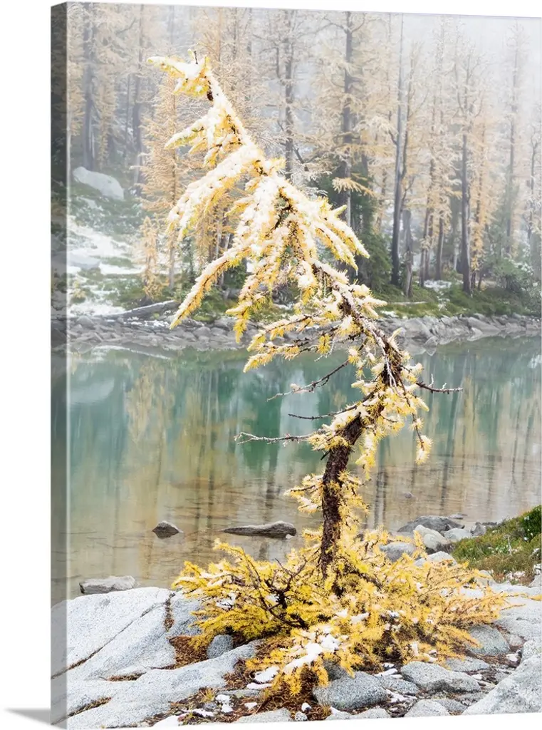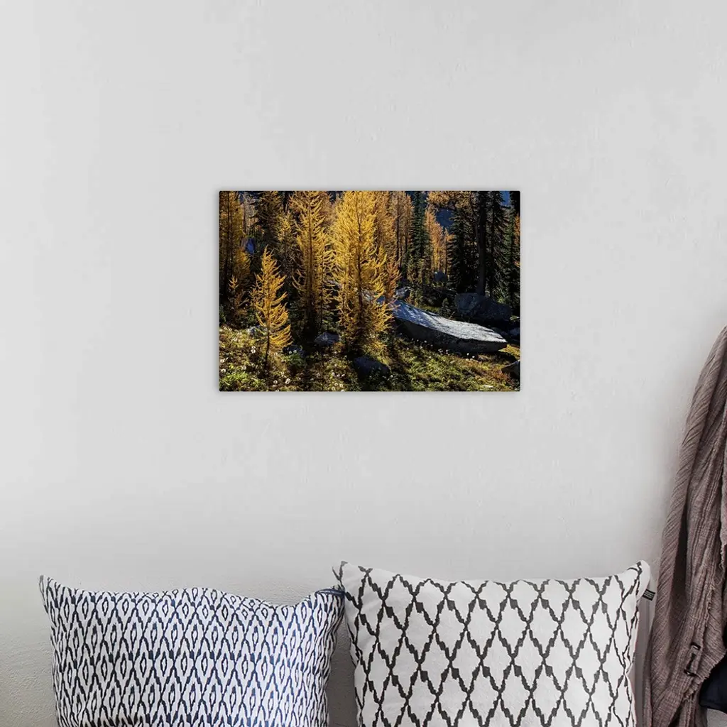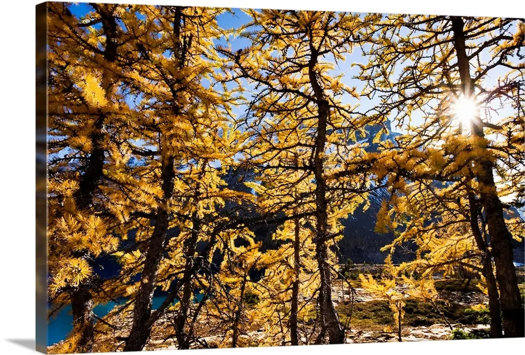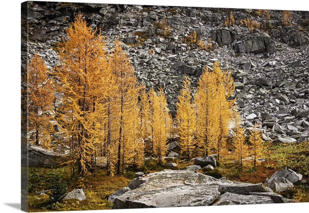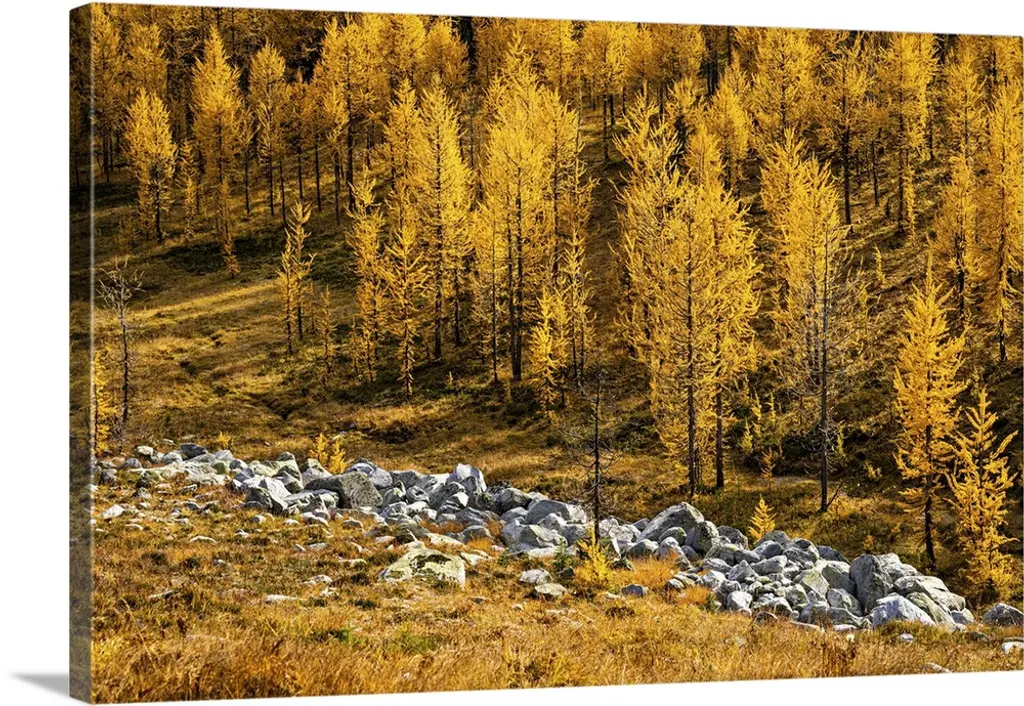 Alpine larches glowing on a warm Fall afternoon in the mountains.