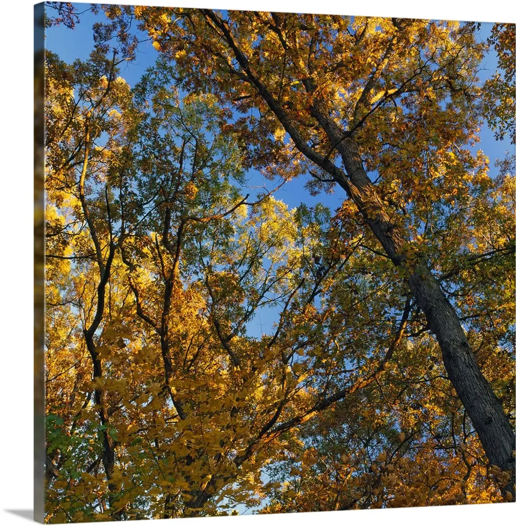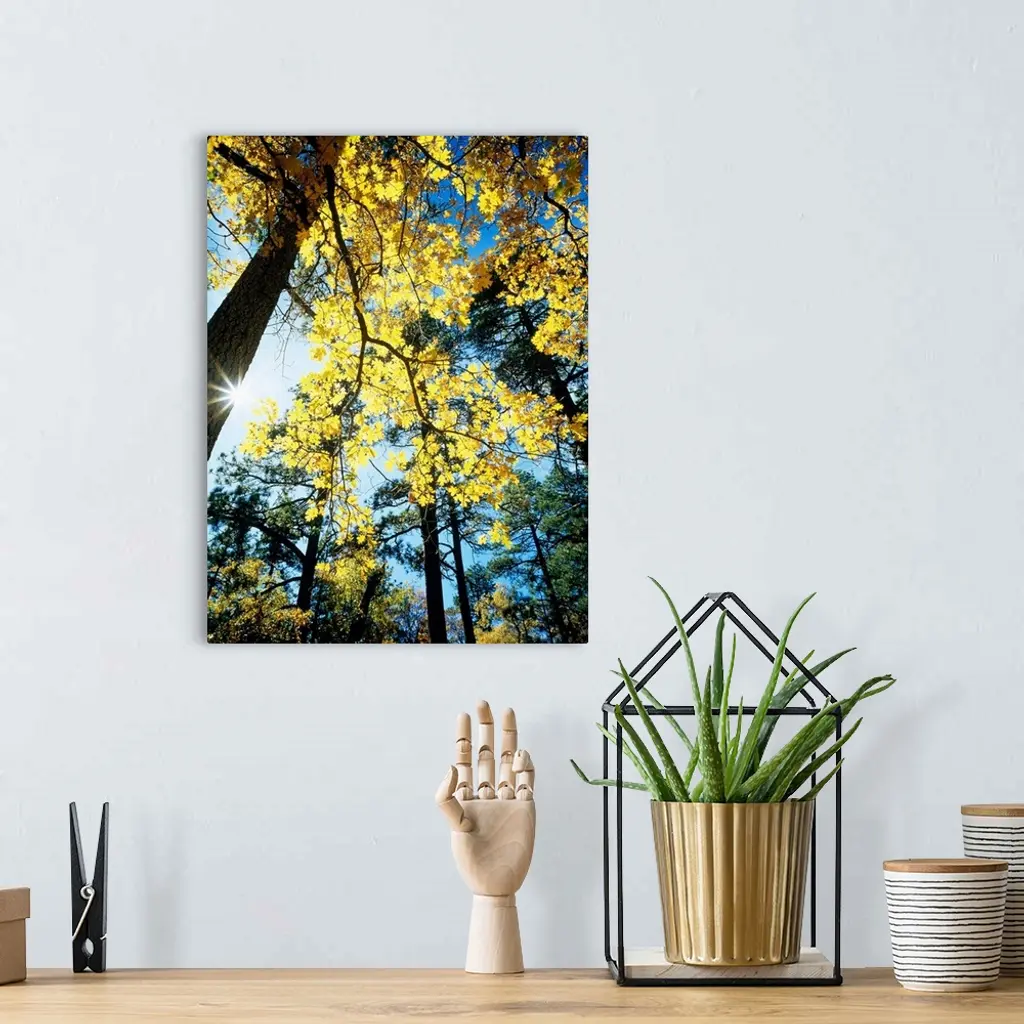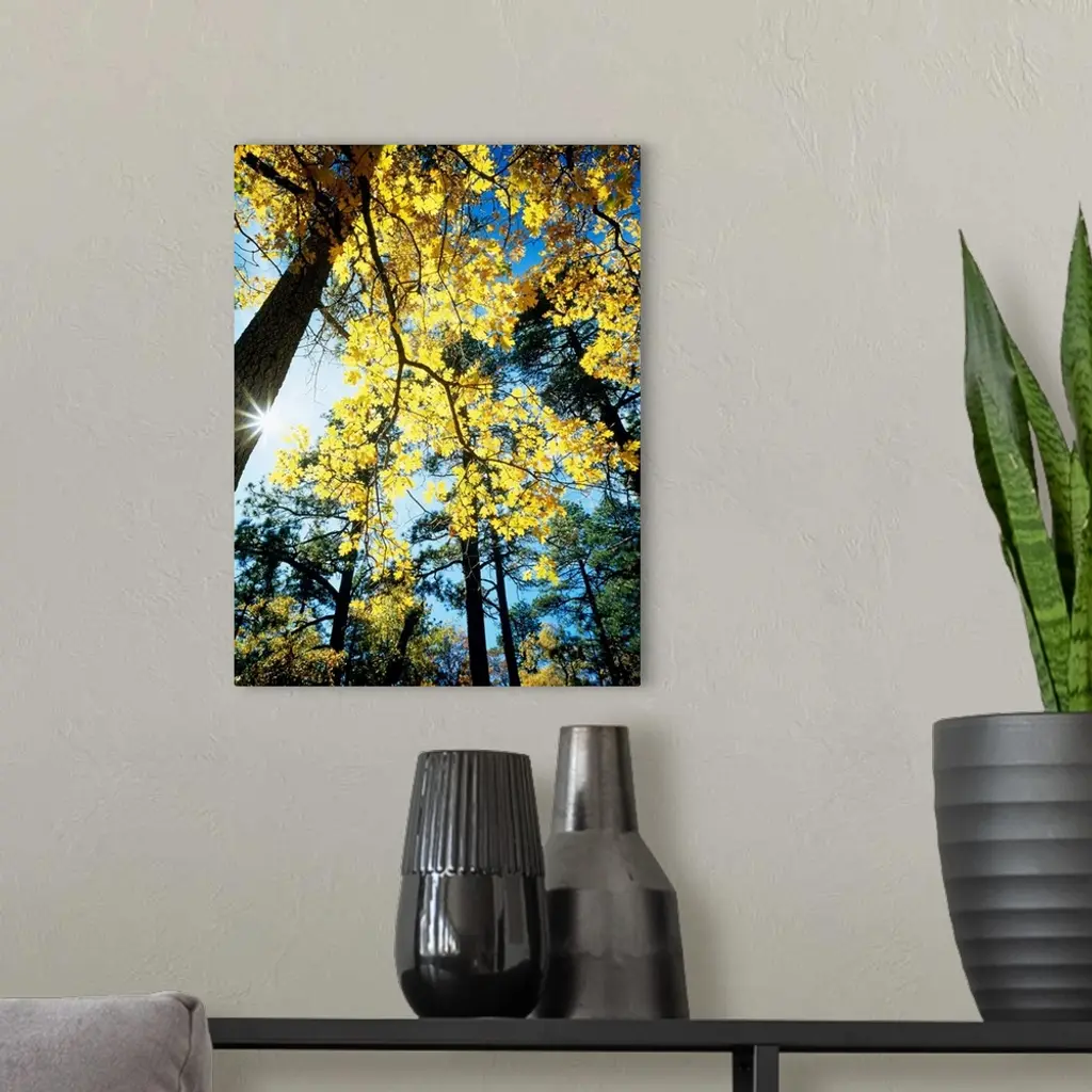 Vertical, low angle photograph, looking toward the bright sun through the golden leaves on the branches of a large tree, several tall pine trees in the background.