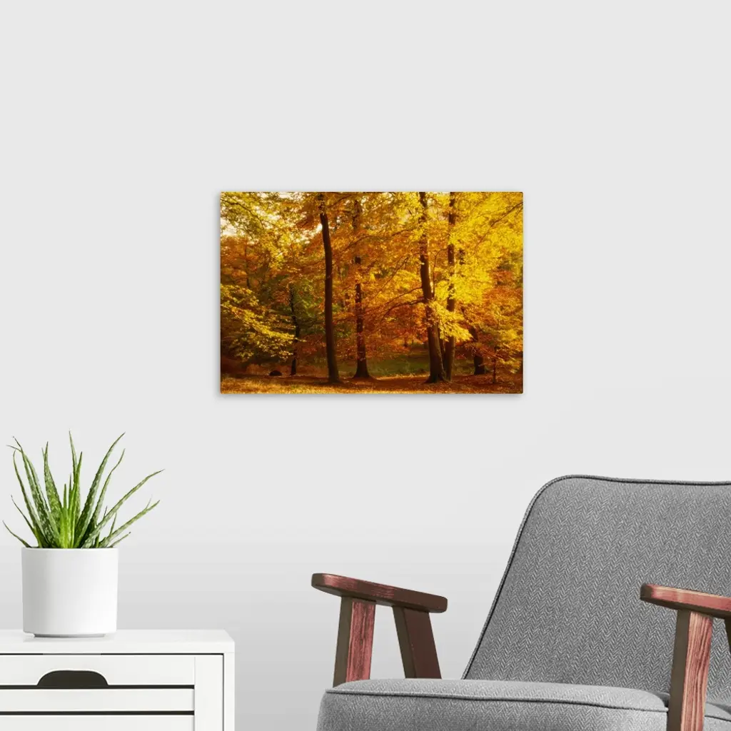 Large photograph displays a set of glowing trees as they sit within an open forest found in the United Kingdom.