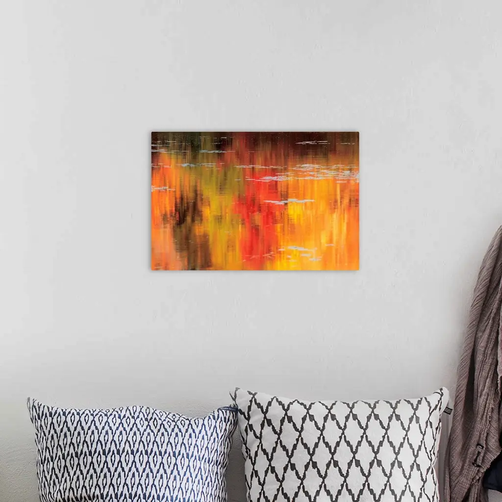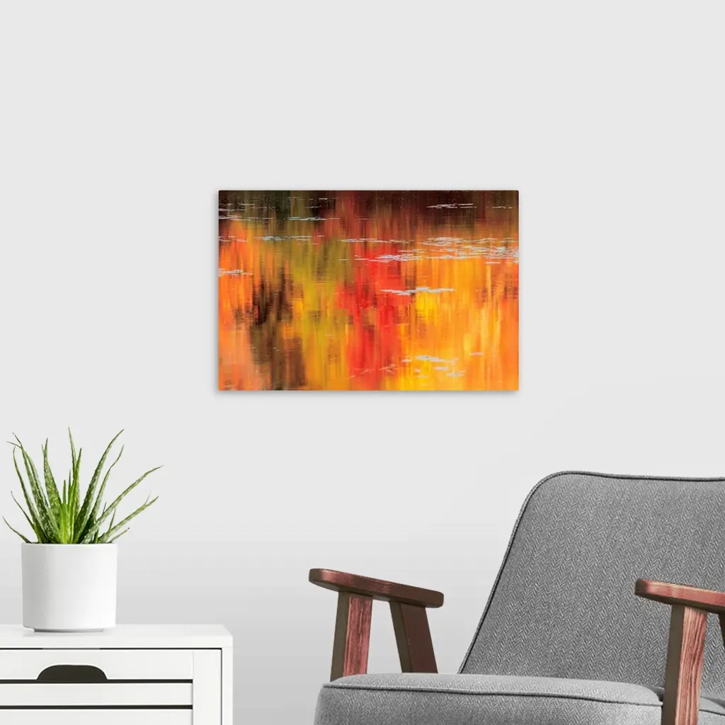 Huge photograph captures the reflection of trees and their brightly colored leaves over the gentle ripples of a pond during a sunny Autumn day.