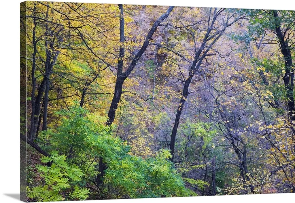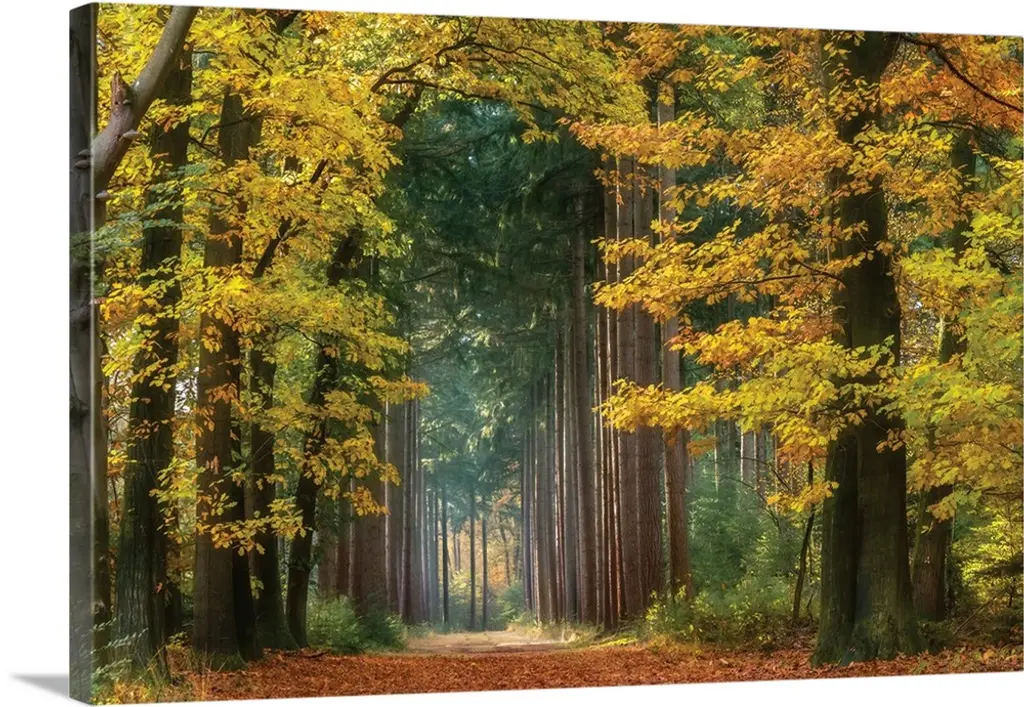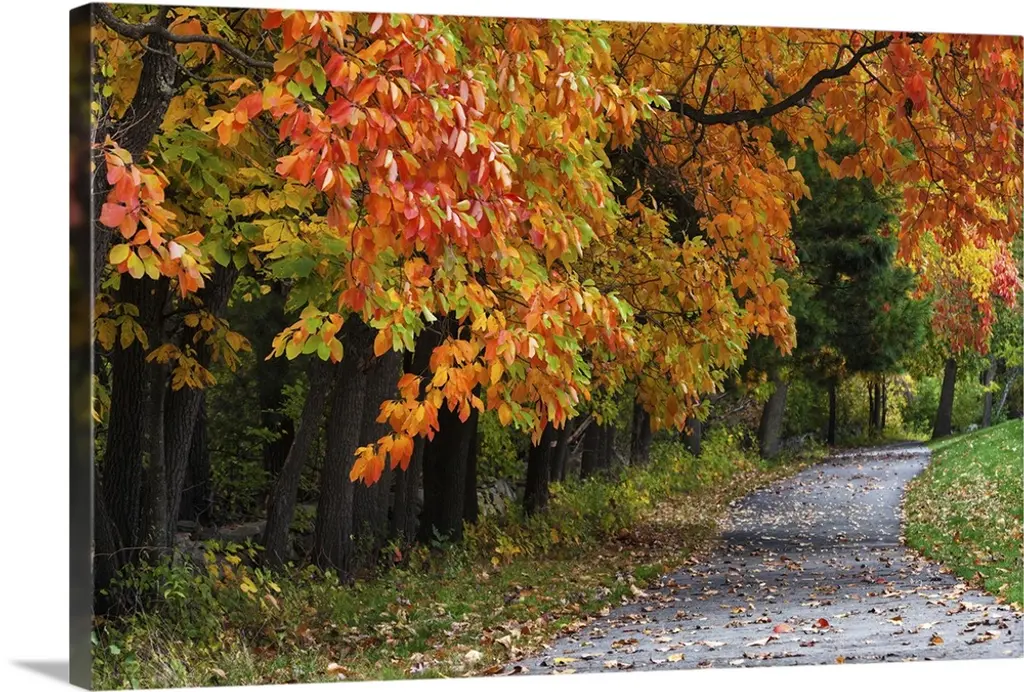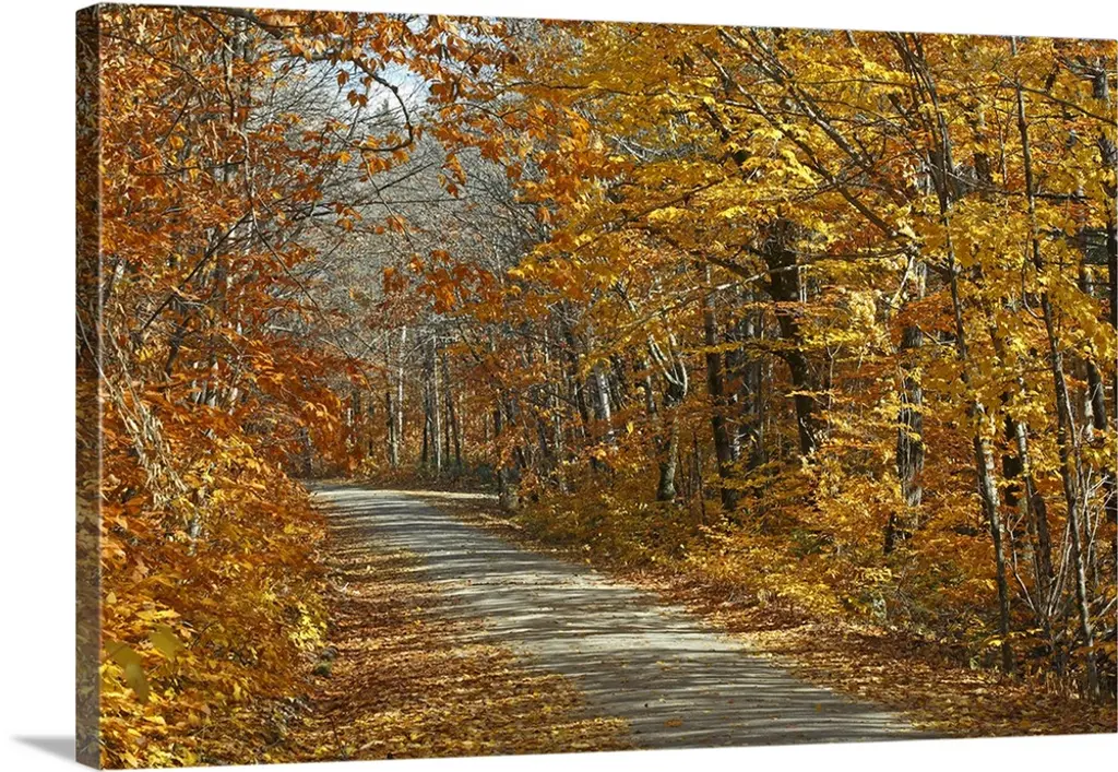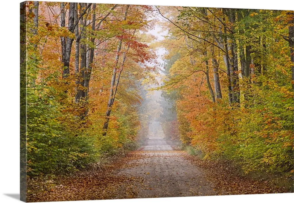 A road that becomes a tunnel through a forest full of fall colors in this horizontal photograph.
