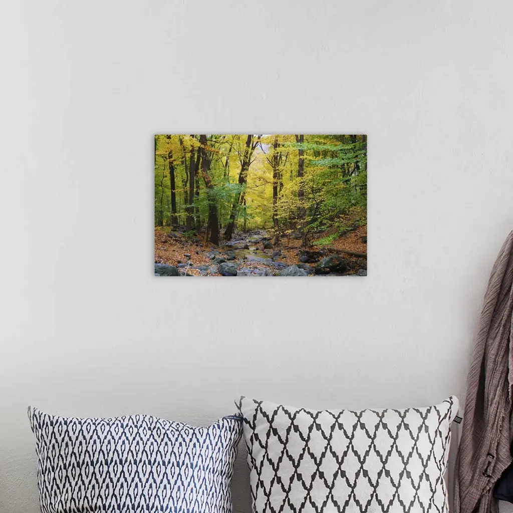 Autumn woods with yellow maple trees and creek with rocks and foliage in mountain.