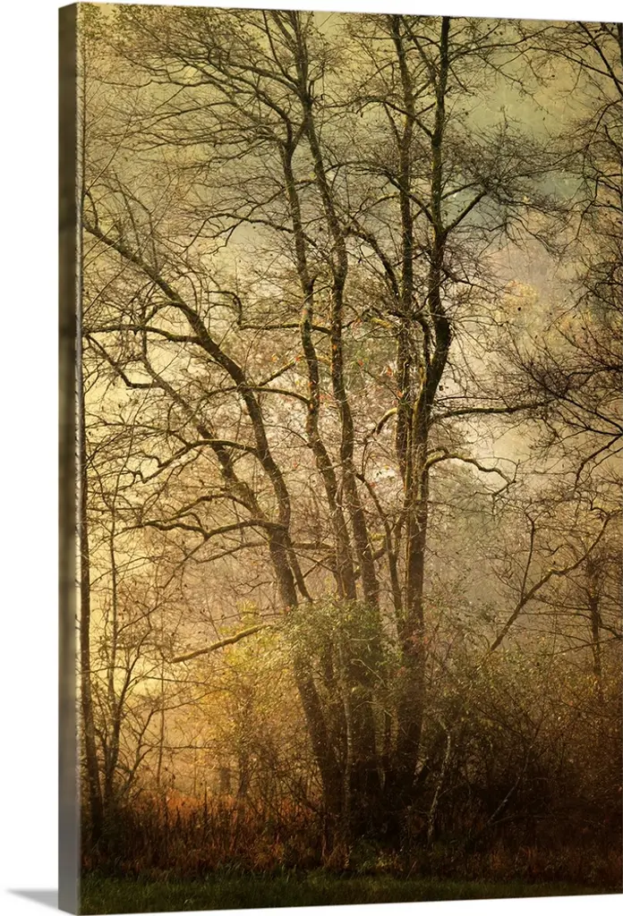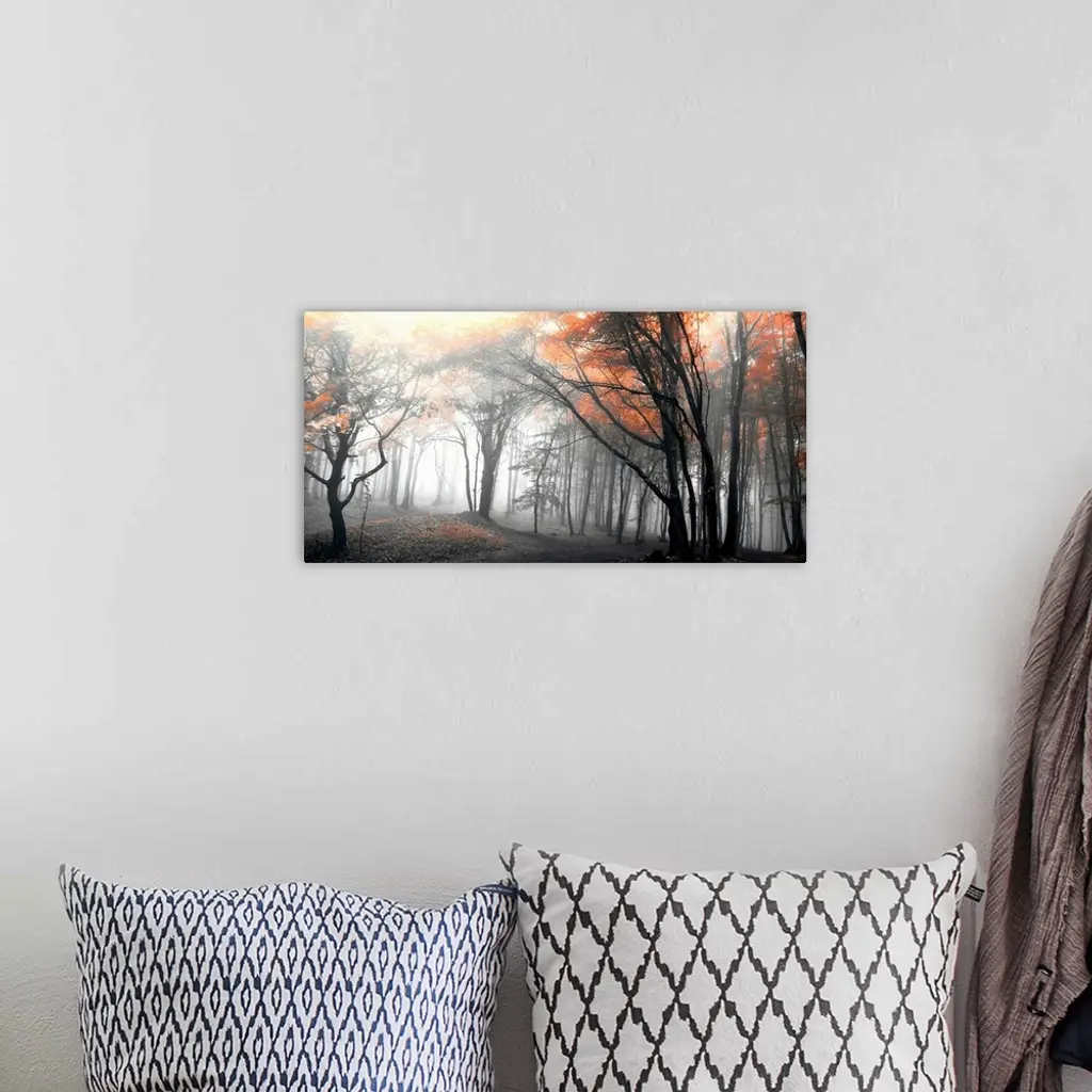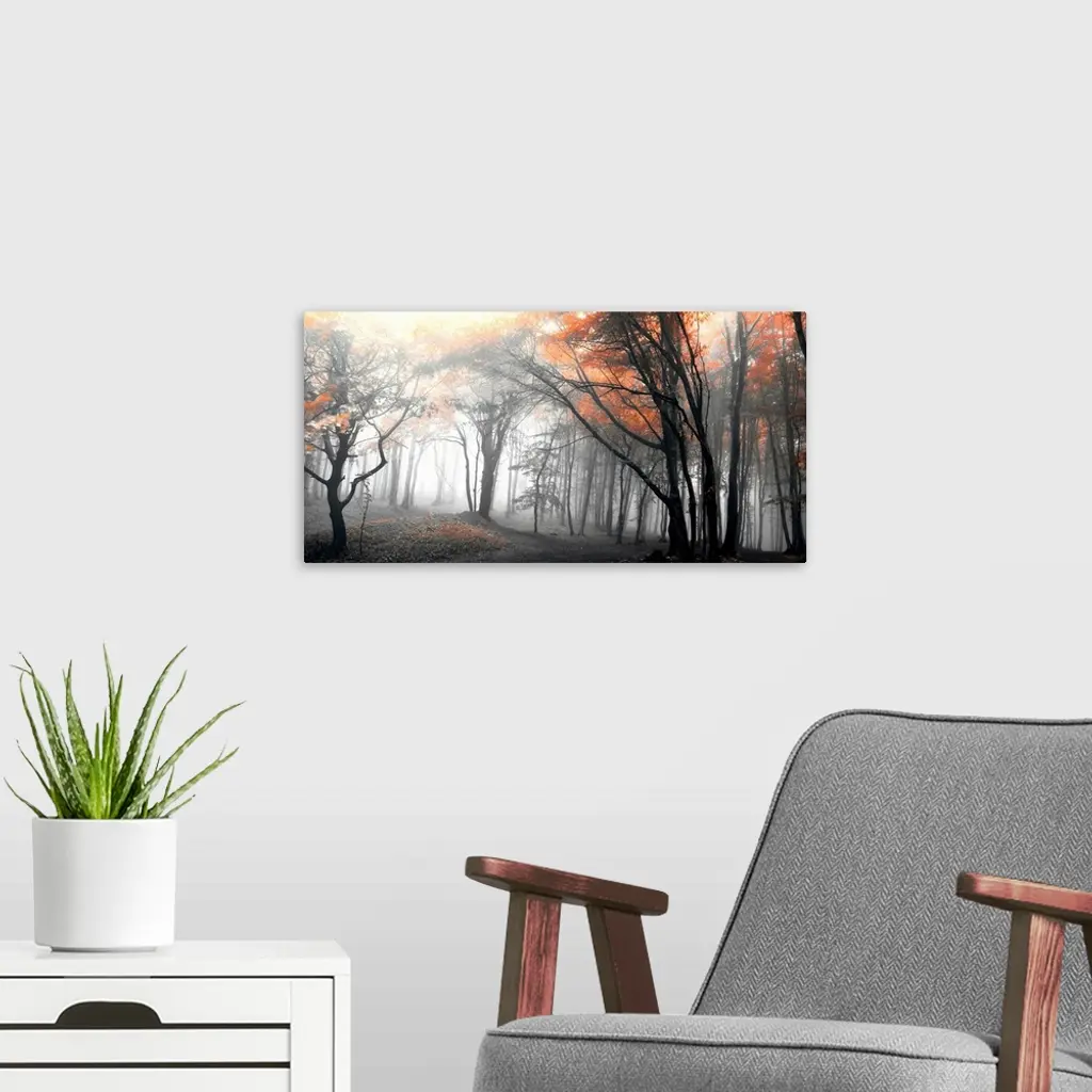 Black and white horizontal landscape of a forest with selective color in the trees.