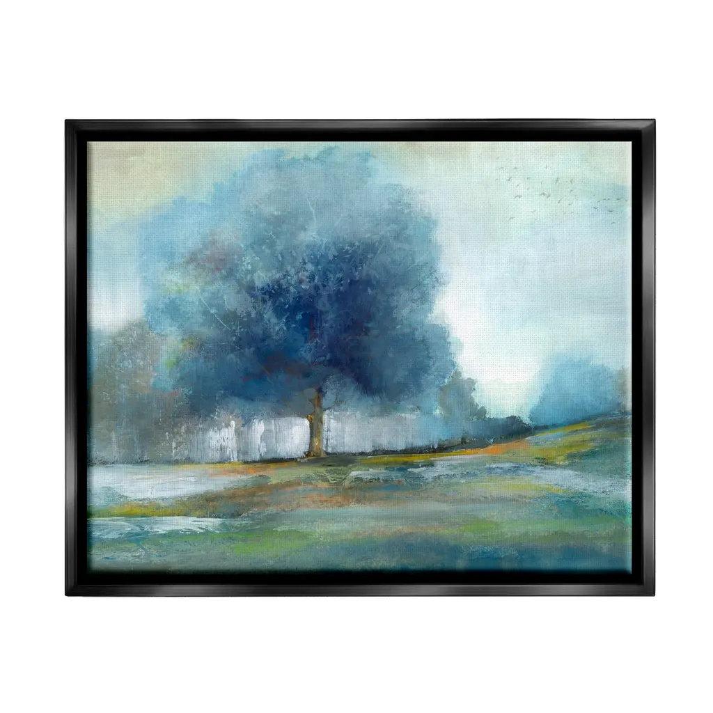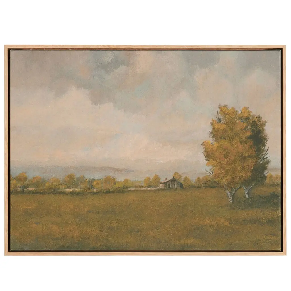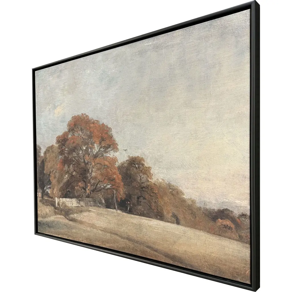 A traditional countryside landscape is alive with the vibrant, rich colors of fall. Canvas is mounted in a satin black wood floater frame.