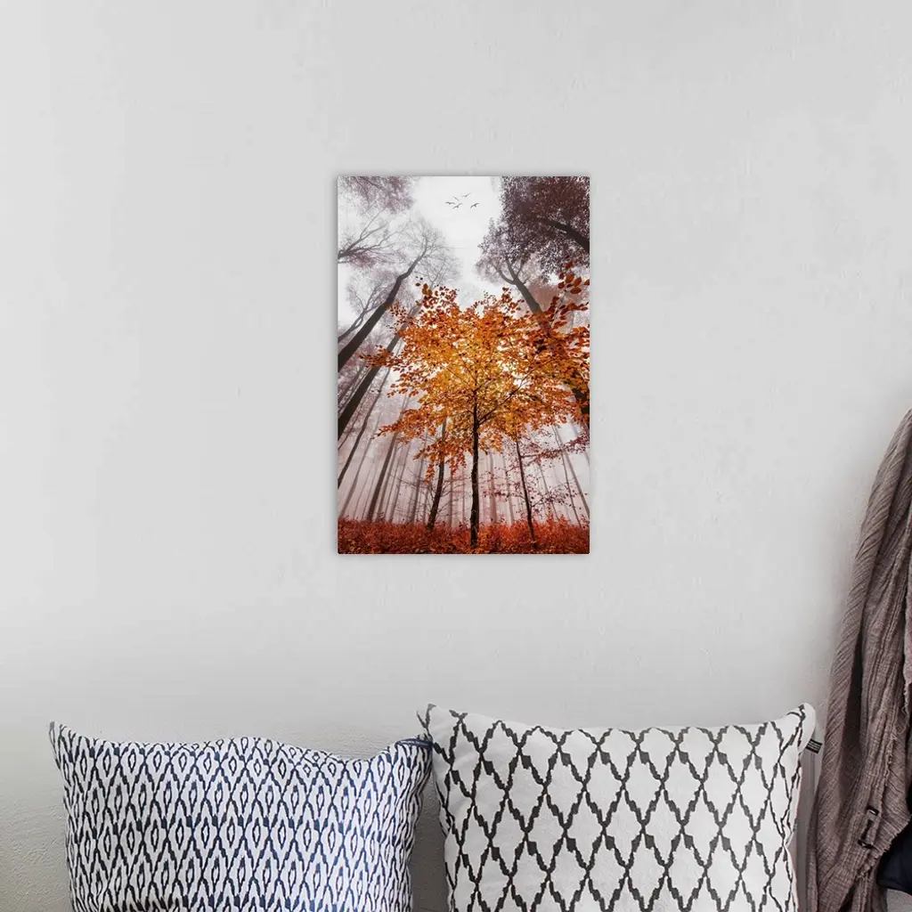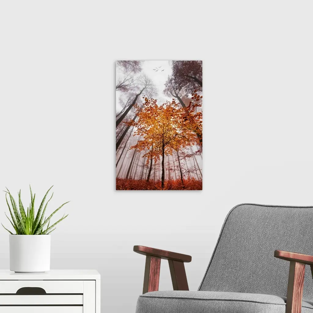 Looking up from the ground though a misty forest of slender trees in fall colors.