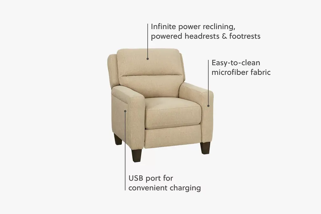Find your perfect reclining position with our Ava recliner. The power recline mechanism offers infinite positions, while the powered headrest and footrest give you the right amount of support. Charge all your devices from the comfort of your recliner with the convenient USB port.