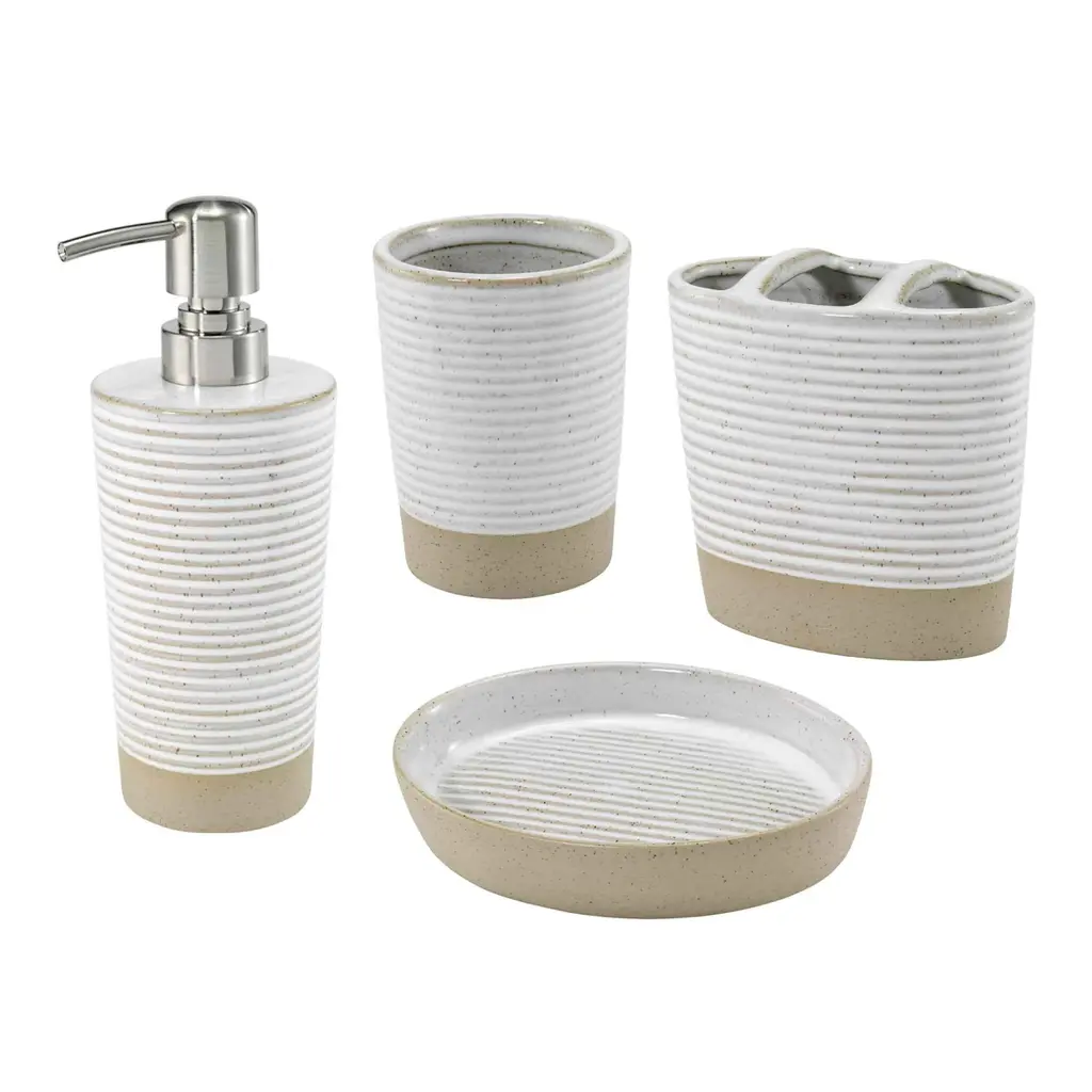 The Avanti Drift 4-Piece Accessory Set features a textured ribbed look with glossy white and linen lines with a solid linen textured matte base. Made of sand clay with white glaze. Set includes 1 each of tumbler, toothbrush holder, soap dish, lotion dispenser. Imported.
