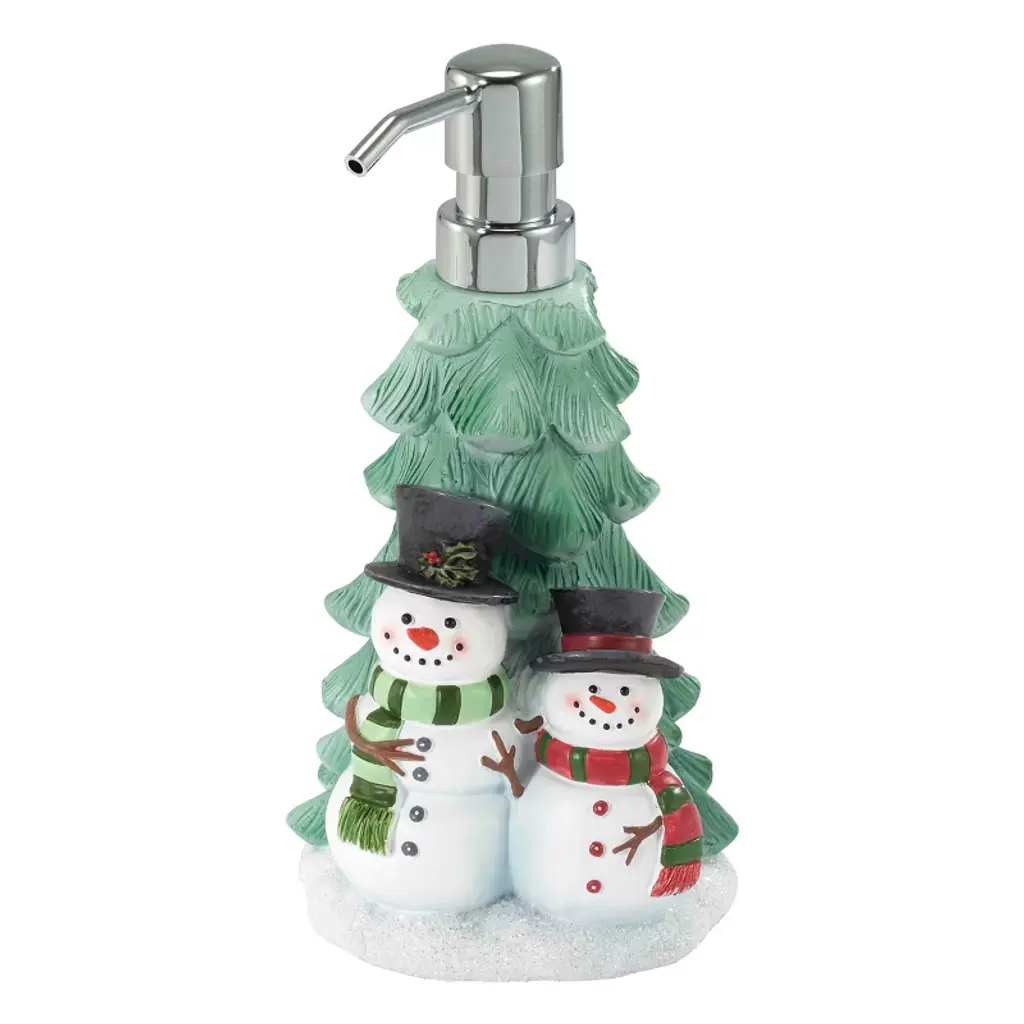 The Avanti Gingerbread Man Soap/ Lotion/Sanitizer Dispenser features a figural gingerbread man with white highlights and colorful buttons and dusted with glitter. He's almost 9" tall, standing on a candy cane striped base. Made of durable, hand-painted resin, finished with a coordinating gold pump.