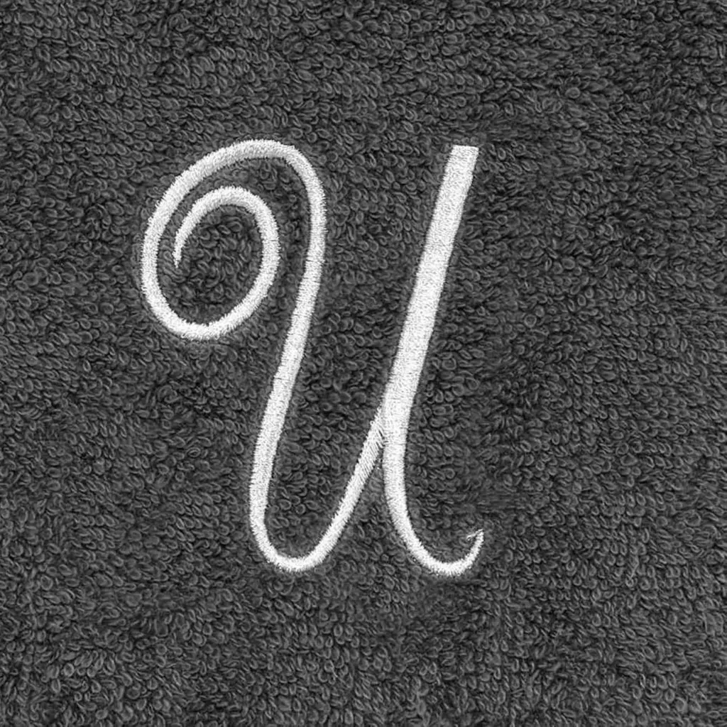 The Premier Granite/Silver Script Monogram Fingertip Towel features an embroidered silver script "U" on a dark grey ground. The 11" x 18" ringspun cotton terry granite towel is plush and absorbent and feels as great as it looks. Matching bath and hand sizes and other letters also available.