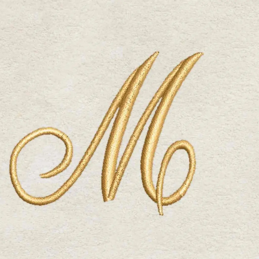 The Premier Ivory with Gold Script Monogram Fingertip Towel features an embroidered metallic gold script "M" on an ivory ground. The 11" x 18" ringspun cotton terry ivory towel is plush and absorbent and feels as great as it looks. Matching bath and hand sizes and other letters also available.