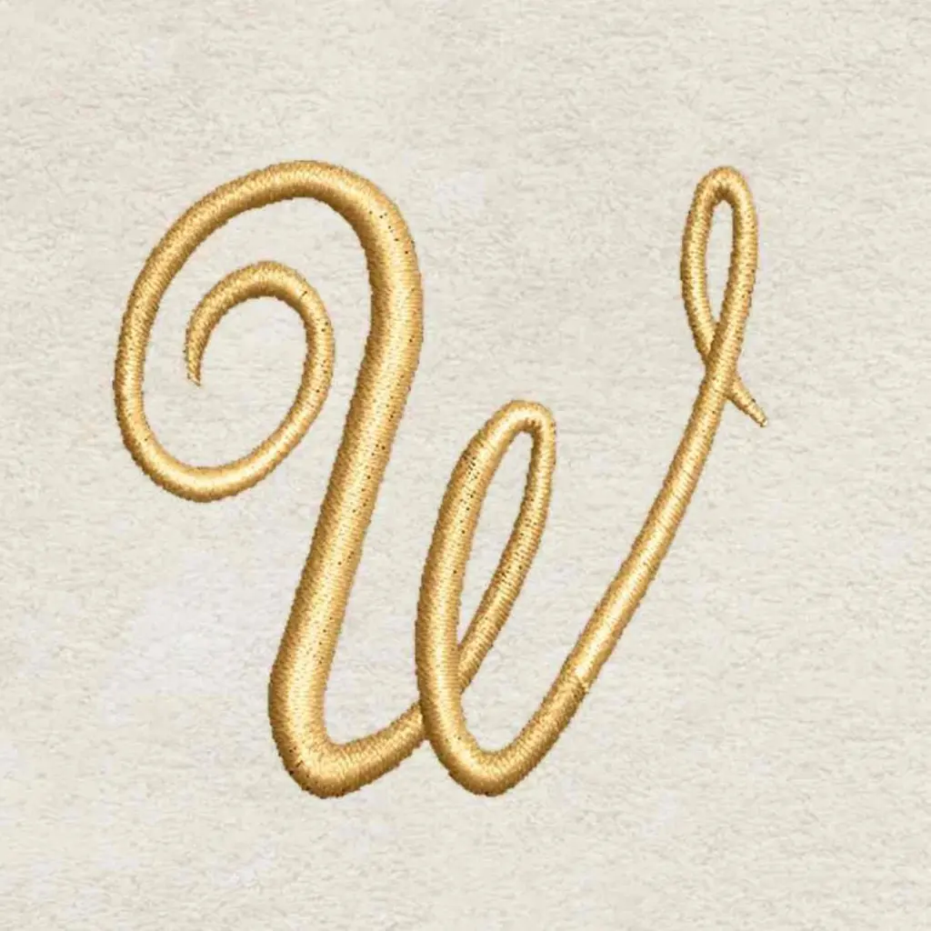 The Premier Ivory with Gold Script Monogram Fingertip Towel features an embroidered metallic gold script "W" on an ivory ground. The 11" x 18" ringspun cotton terry ivory towel is plush and absorbent and feels as great as it looks. Matching bath and hand sizes and other letters also available.