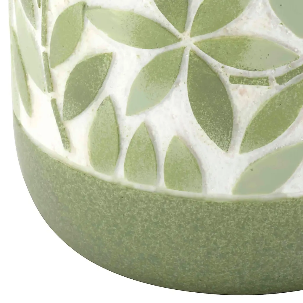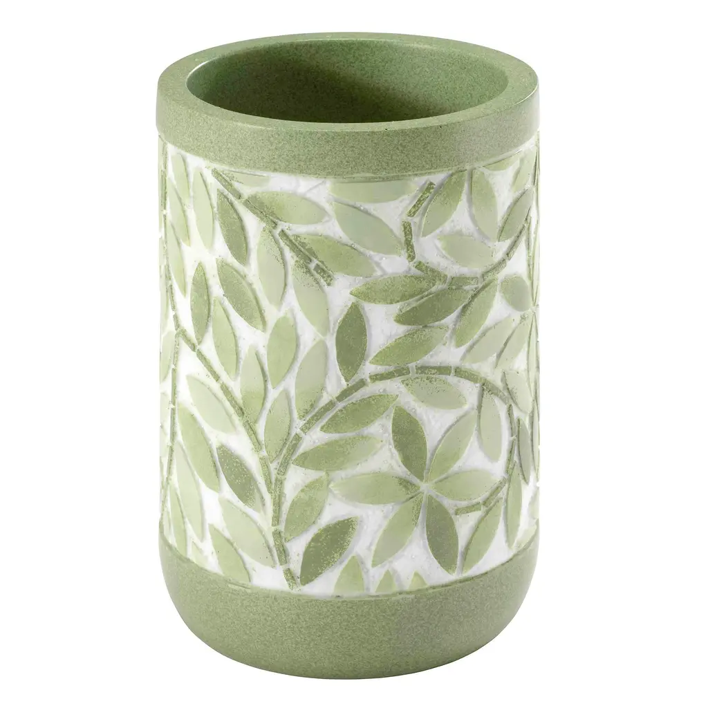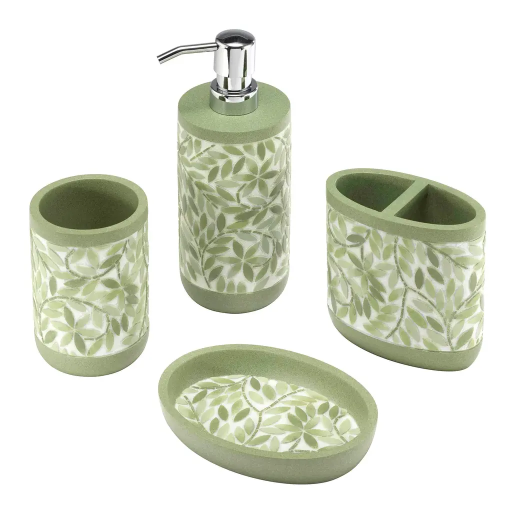 The Avanti Stratford Green 4-Pc. Accessory Set features a raised leaf and vine design in various shades of green with a matching top border and base. Made of durable, hand-painted resin. Set includes 1 each of tumbler, toothbrush holder, soap dish, lotion dispenser.