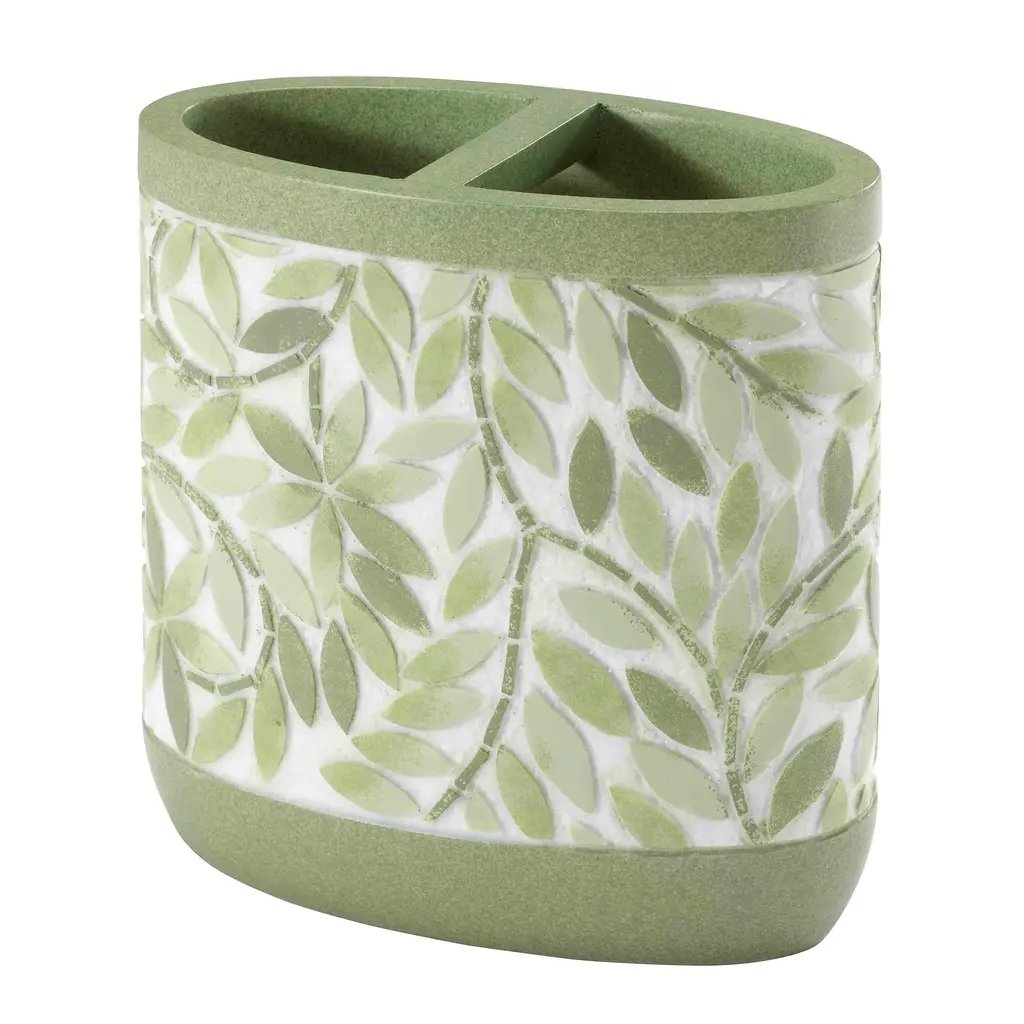The Avanti Stratford Green 2-Pc. Lotion, Soap and Sanitizer Dispenser (1) and Toothbrush Holder(1) Set features a raised leaf and vine design in shades of green with a matching top border and base. Shiny silver pump on the dispenser. Made of durable, hand-painted resin.