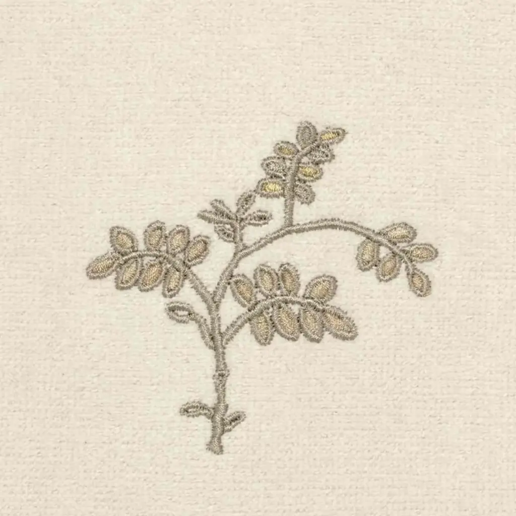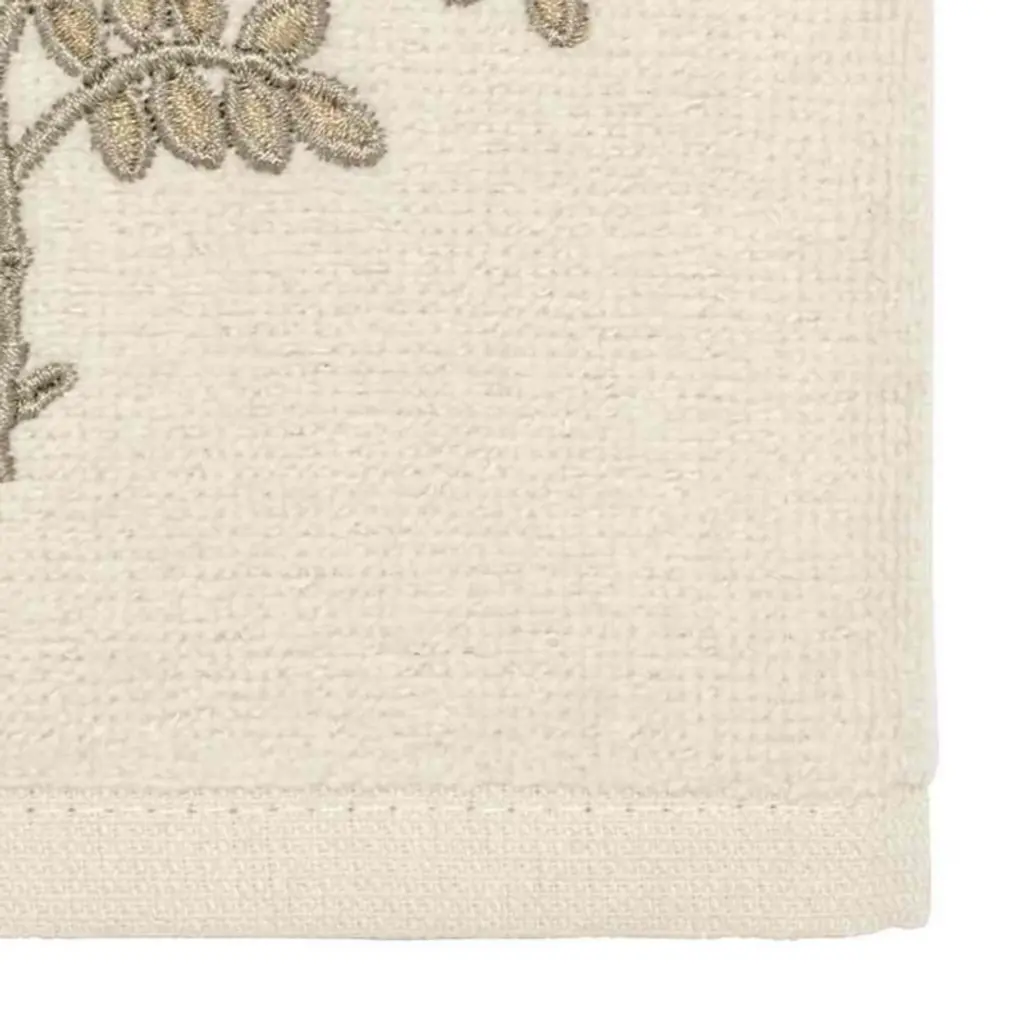 The Avanti Willow Ivory Fingertip Towel features an embroidered gold and taupe branch and leaves on an ivory ground. The 11" x 18", 100% cotton ivory towel is sheared for a silky, smooth finish. Also available in bath and hand sizes.