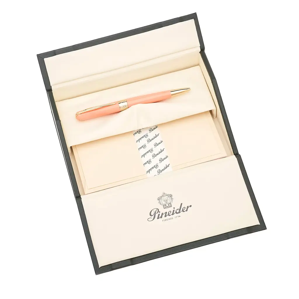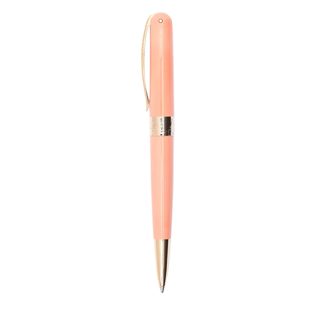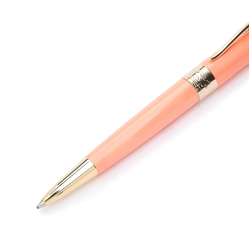 This ballpoint pen stands out with its soft peach color, offering a fresh and modern aesthetic. The warm pastel hue contrasts delicately with the gold-plated trim, giving it a graceful, feminine charm. The lightweight design ensures easy handling, while its perfectly balanced shape provides a seamless writing experience. Subtle yet eye-catching, this pen is an ideal companion for personal journaling, creative tasks, or as a stylish addition to a chic workspace.