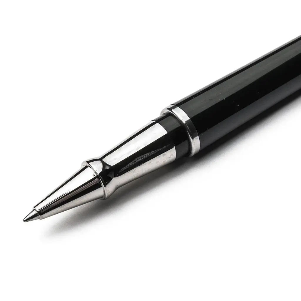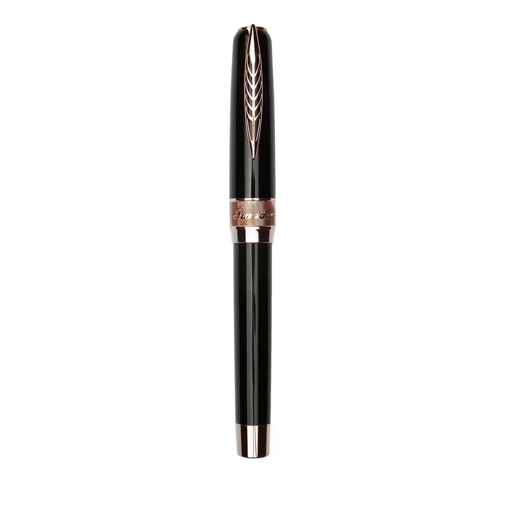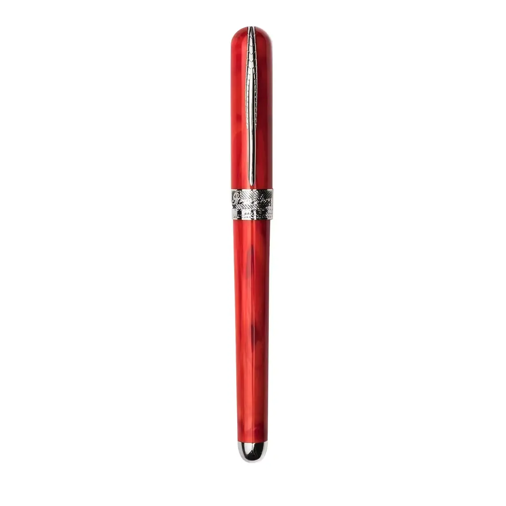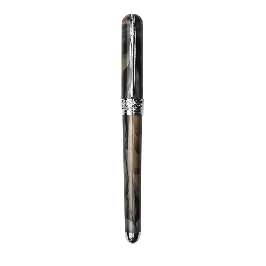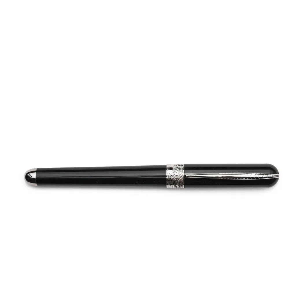 This ultra-elegant fountain pen is distinguished by a black body in UltraResin, a special material developed by Pineider mixing nacre and resin for enhanced weather-resistance and durability. The pen's parts are assembled through an interlocking system without glue and feature a feather-shaped clip in marine steel, a soft-close cap lock, complemented by a bright central band displaying a finely engraved skyline of Florence. The filling is with cartridge or converter and the steel nib is available in different sizes. Please contact the Concierge for customization options available.