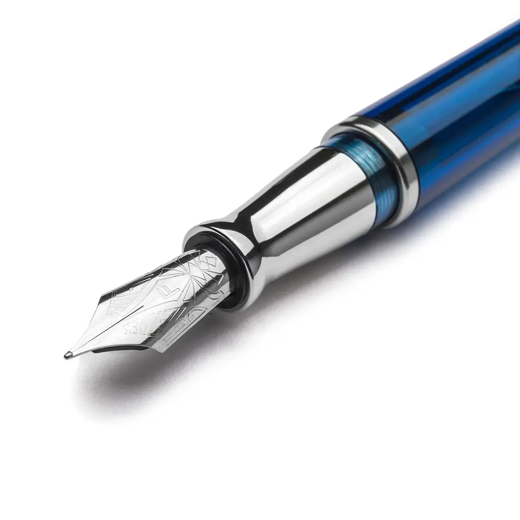 This remarkable fountain pen features a stunning demi-transparent design with an ink level gauge printed on the side of the converter to keep it monitored. It is crafted of break-resistant blue UltraResin developed by Pineider employing an adhesive-free, glue-less assembly. Featuring a soft-close cap lock, the pen flaunts a shiny central band engraved with the iconic skyline of Florence, which harmonizes with the feather-shaped clip in marine steel, and with prized details in 0.2 palladium. Please ask the Concierge for the cartridge filling and for the nib is available in three sizes: extra fine, fine and medium.