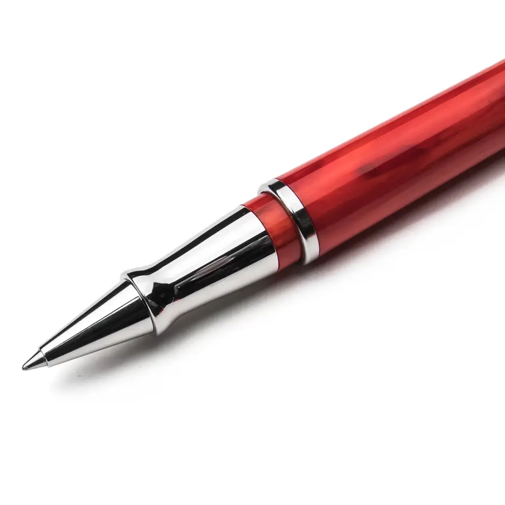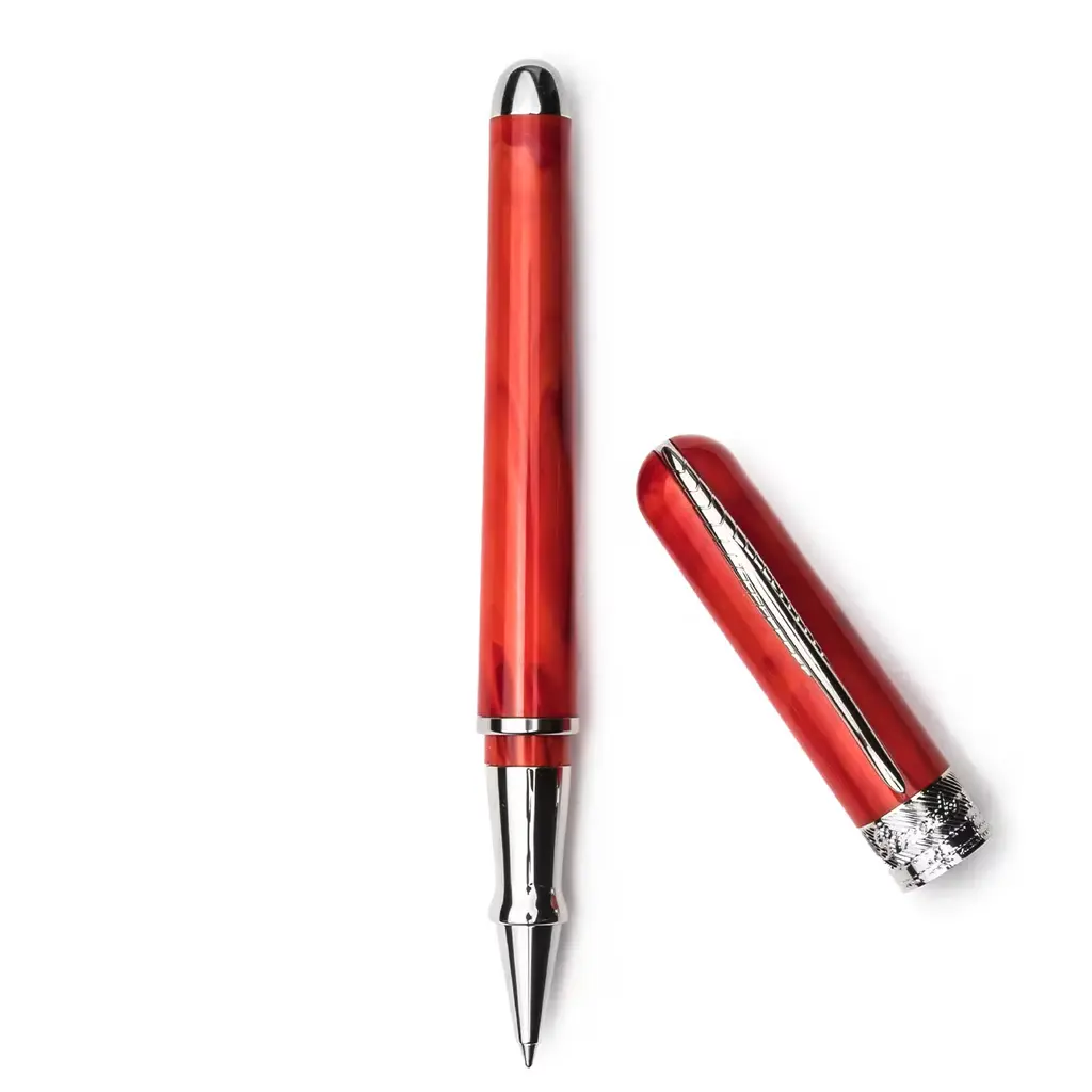 Made of red UltraResin - an incredibly stiff material developed by Pineider combining nacre and resin - this fountain pen is marked by a powerful aesthetic. The feather-shaped clip in marine steel, the soft-close cap lock, minute palladium 0.2 inserts, and finally the central band with a finely engraved skyline of Florence make for a luxe and seductive look. It is crafted using 3D technology allowing to obtain an interlocking system with no glues needed. Please ask the Concierge for customization options available including color and N°6 steel nib size. Cartridge filling supported.