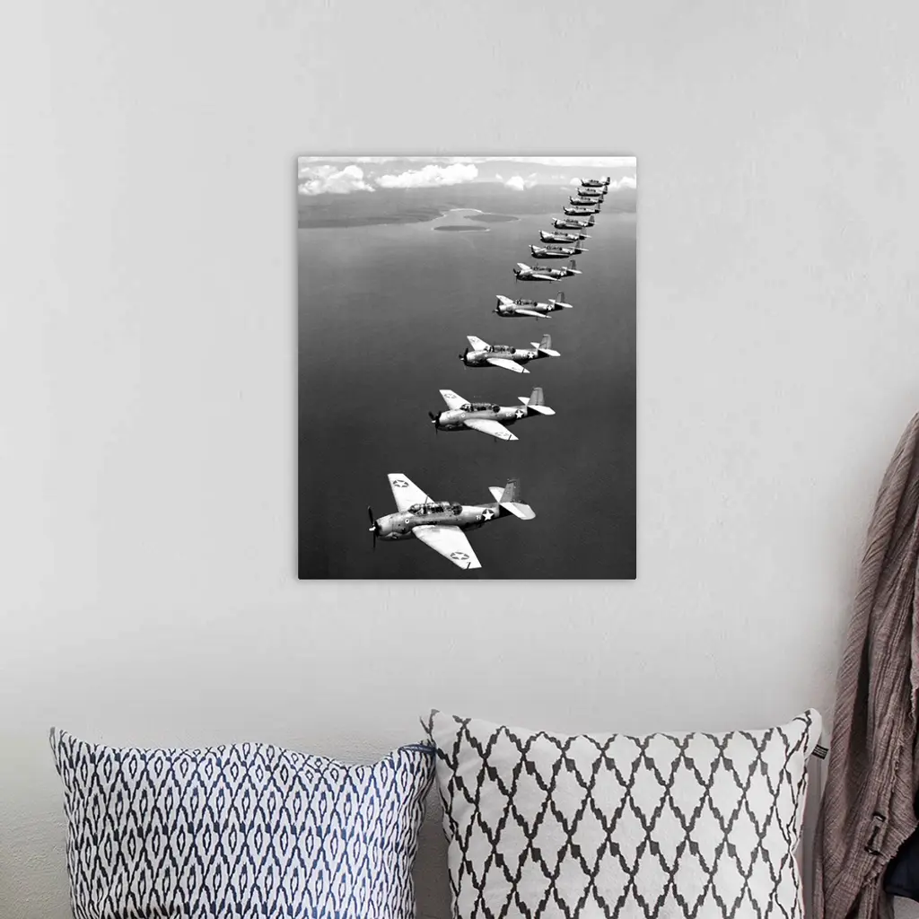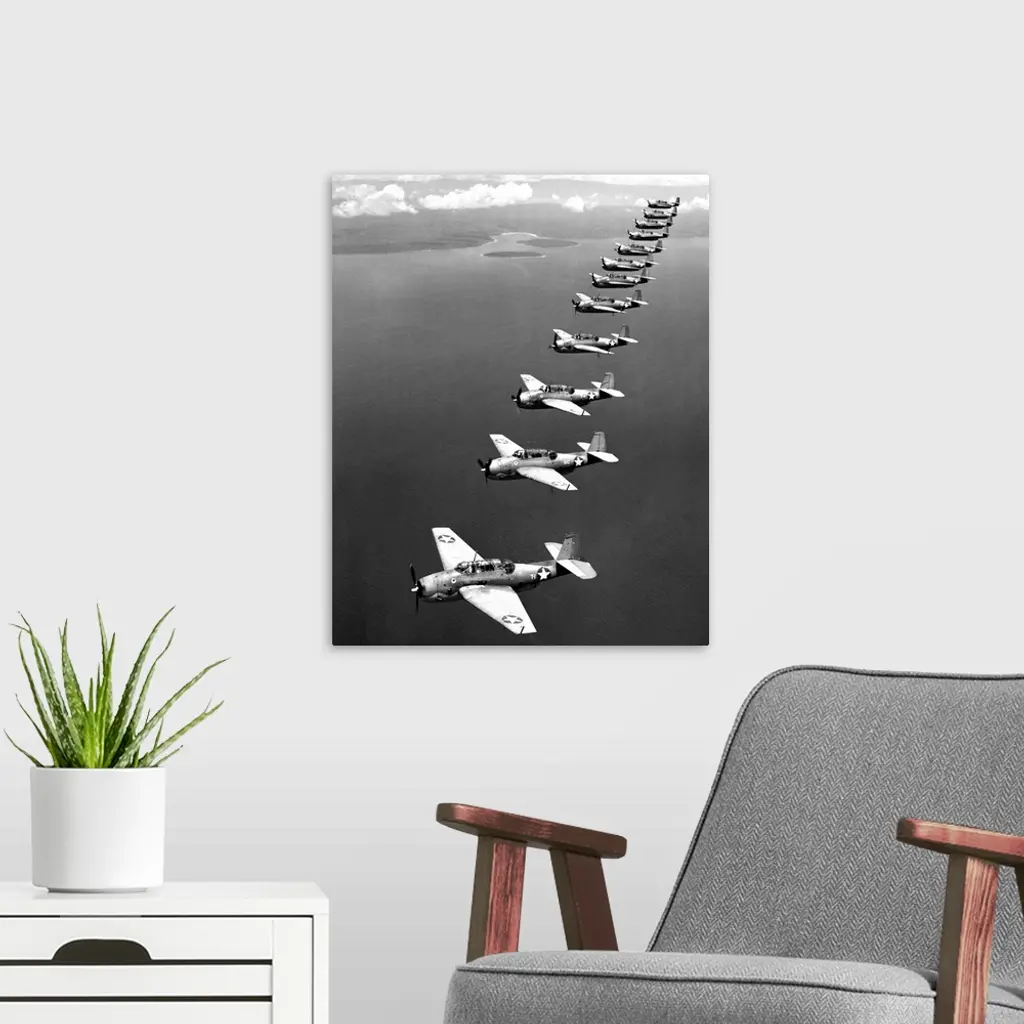A flight of twelve Grumman 'Avenger' torpedo-bombers over the South Pacific, 1943, during World War II.