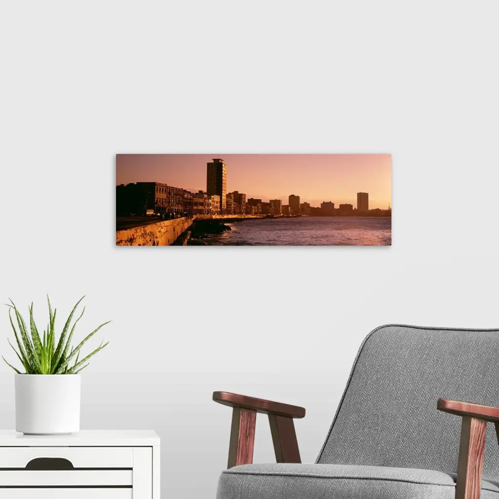 This wide angle picture is taken of buildings lining a body of water in Havana Cuba during sun down.