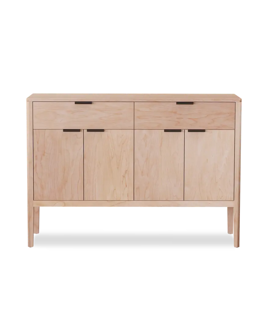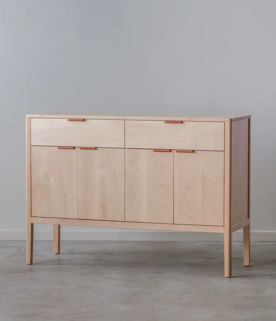 Let the natural wood grain of this credenza be the focus in your living room. The custom leather pulls are designed and made in Chicago. Features two drawers with soft close slides, two adjustable shelves, and cord cutouts for your organization needs. Doors have soft close hinges.