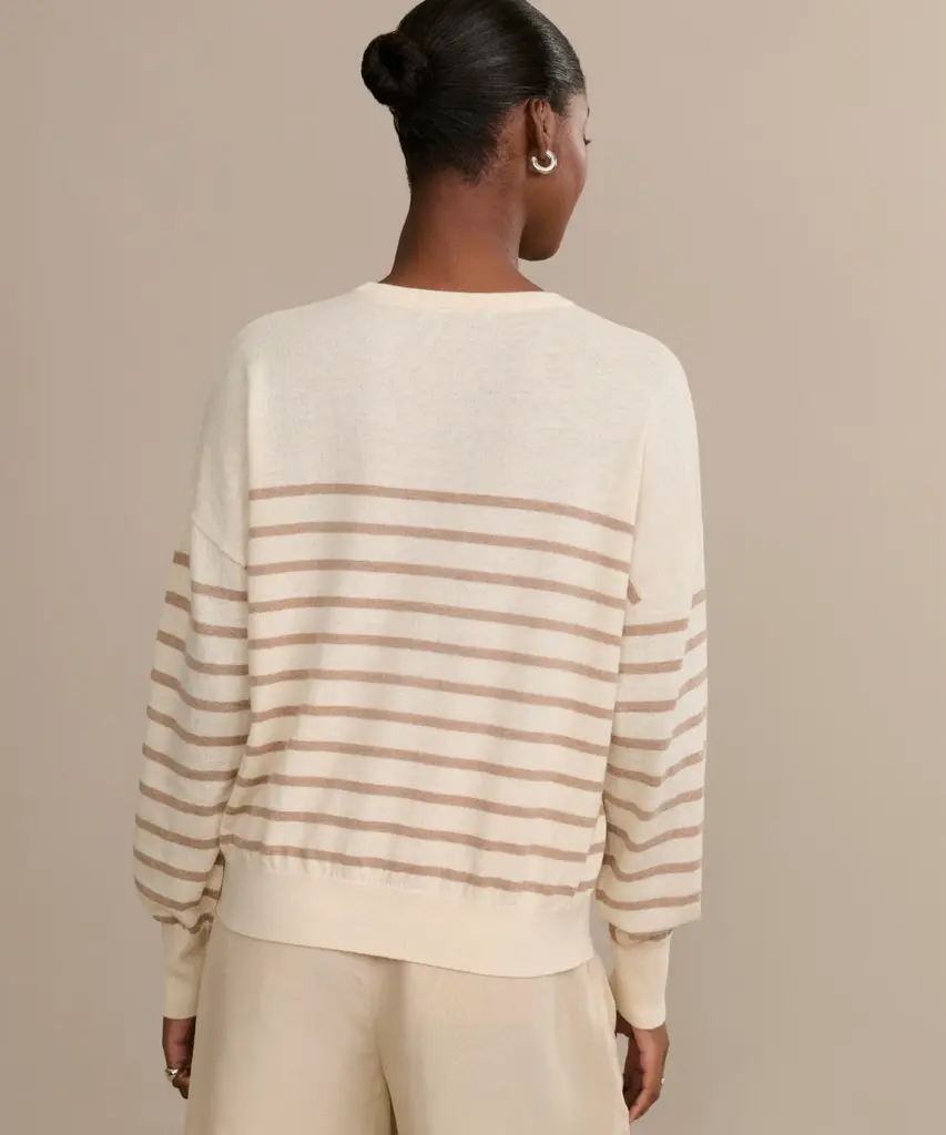 Avery Crewneck Ivory/Oat Stripe In a new cotton-merino blend, the Avery Crewneck offers an ultra-lightweight feel and features a ribbed trim, relaxed drop shoulder, and timeless stripes for effortless everyday wear. Pair it with jeans or drape it over your shoulders with a dress for a relaxed, coastal look.