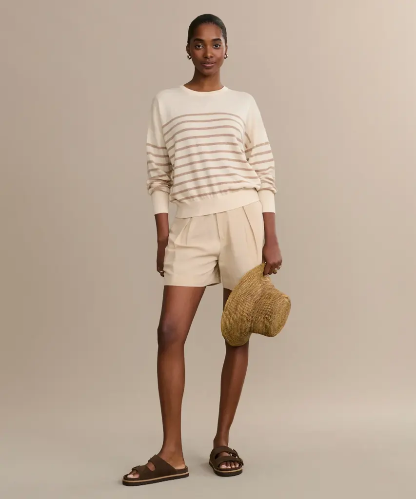 Avery Crewneck Ivory/Oat Stripe In a new cotton-merino blend, the Avery Crewneck offers an ultra-lightweight feel and features a ribbed trim, relaxed drop shoulder, and timeless stripes for effortless everyday wear. Pair it with jeans or drape it over your shoulders with a dress for a relaxed, coastal look.
