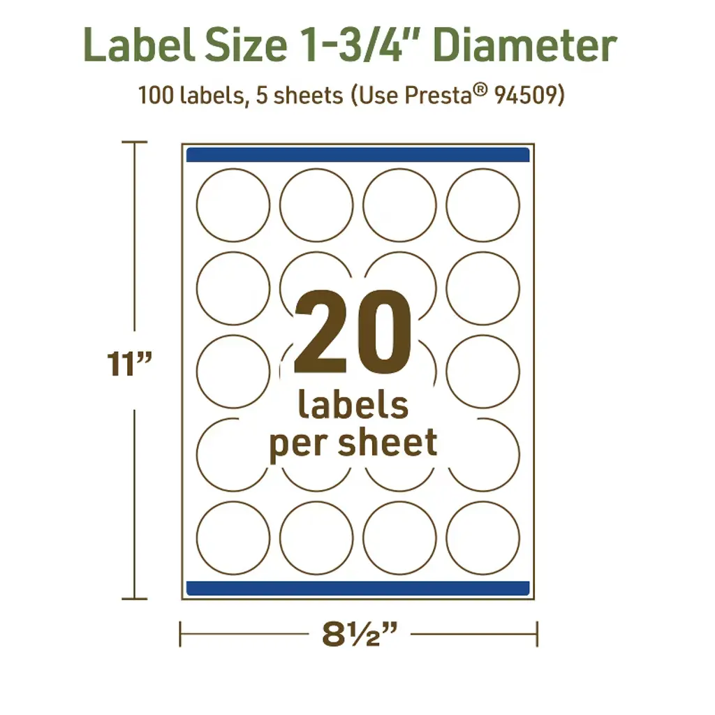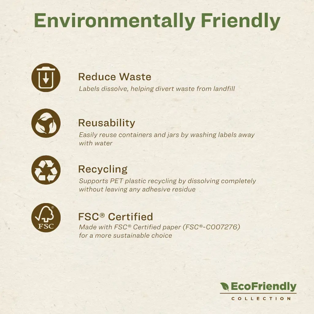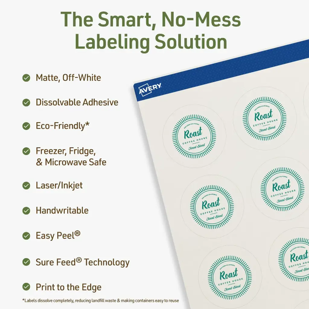 Add a personal touch to product labels, mason jar labels, container labels, and more with Avery Dissolvable Matte White 1-3/4" diameter Round Labels. Designed for easy cleanup, these printable labels dissolve completely in 30 seconds without leaving behind any sticky residue. With an FDA-compliant adhesive for indirect food contact, these sticker labels are also freezer-, refrigerator-, and microwave-safe. These eco-friendly labels dissolve without adhesive buildup, helping reduce waste by making it easier to reuse containers while also supporting recycling. Sure Feed technology reduces jams or smudges by creating a more reliable feed through your printer. Compatible with laser and inkjet printers, these printable labels allow you to create custom labels for home, business, or food service needs. Choose a smarter, more sustainable way to label with these dissolvable Avery labels that keep your kitchen, business, and storage organized without the mess.