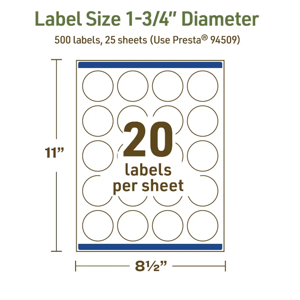 Add a personal touch to product labels, mason jar labels, container labels, and more with Avery Dissolvable Matte White 1-3/4" diameter Round Labels. Designed for easy cleanup, these printable labels dissolve completely in 30 seconds without leaving behind any sticky residue. With an FDA-compliant adhesive for indirect food contact, these sticker labels are also freezer-, refrigerator-, and microwave-safe. These eco-friendly labels dissolve without adhesive buildup, helping reduce waste by making it easier to reuse containers while also supporting recycling. Sure Feed technology reduces jams or smudges by creating a more reliable feed through your printer. Compatible with laser and inkjet printers, these printable labels allow you to create custom labels for home, business, or food service needs. Choose a smarter, more sustainable way to label with these dissolvable Avery labels that keep your kitchen, business, and storage organized without the mess.