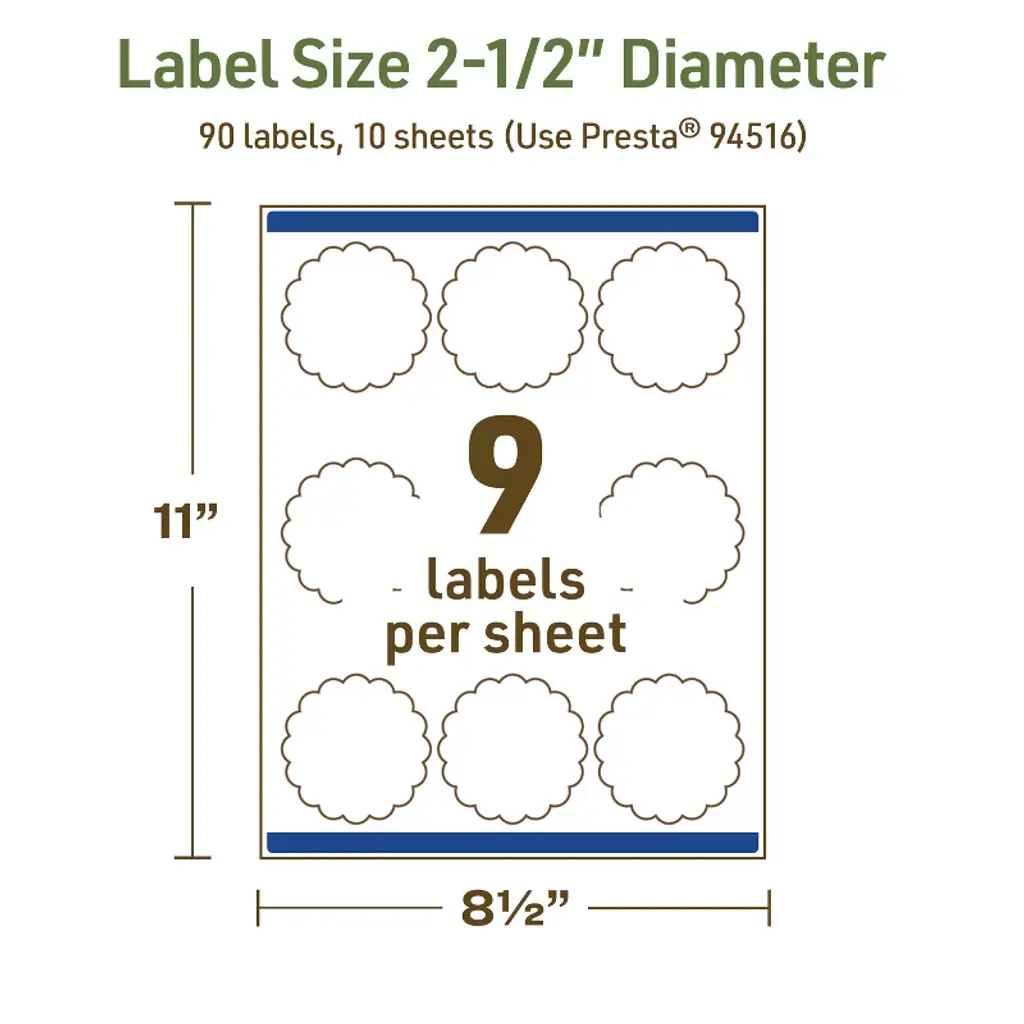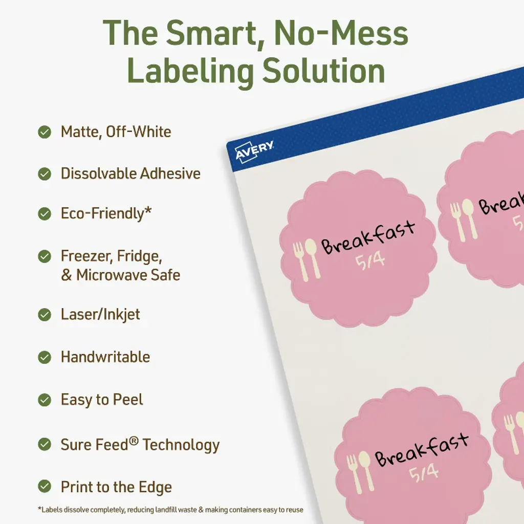 Add a personal touch to homemade jam labels, jar labels, food packaging labels, and more with Avery Dissolvable Matte White 2-1/2" diameter Round Scalloped Labels. Designed for easy cleanup, these printable labels dissolve completely in 30 seconds without leaving behind any sticky residue. With an FDA-compliant adhesive for indirect food contact, these sticker labels are also freezer-, refrigerator-, and microwave-safe. These eco-friendly labels dissolve without adhesive buildup, helping reduce waste by making it easier to reuse containers while also supporting recycling. Sure Feed technology reduces jams or smudges by creating a more reliable feed through your printer. Compatible with laser and inkjet printers, these printable labels allow you to create custom labels for home, business, or food service needs. Choose a smarter, more sustainable way to label with these dissolvable Avery labels that keep your kitchen, business, and storage organized without the mess.